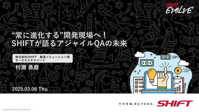 2025/3/6 アジャイルQA対決 Startup vs 大企業 (Agile in Motion vol.3) https://shiftevolve.connpass.com/event/346672/ 株式会社SHIFT 村瀬 勇磨