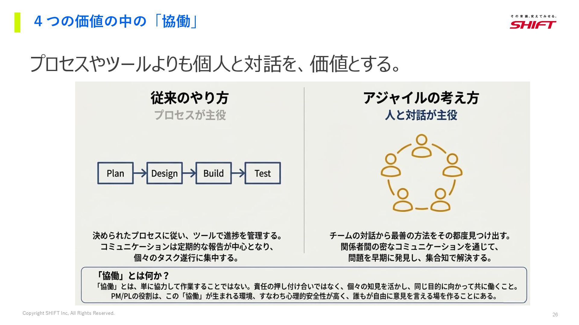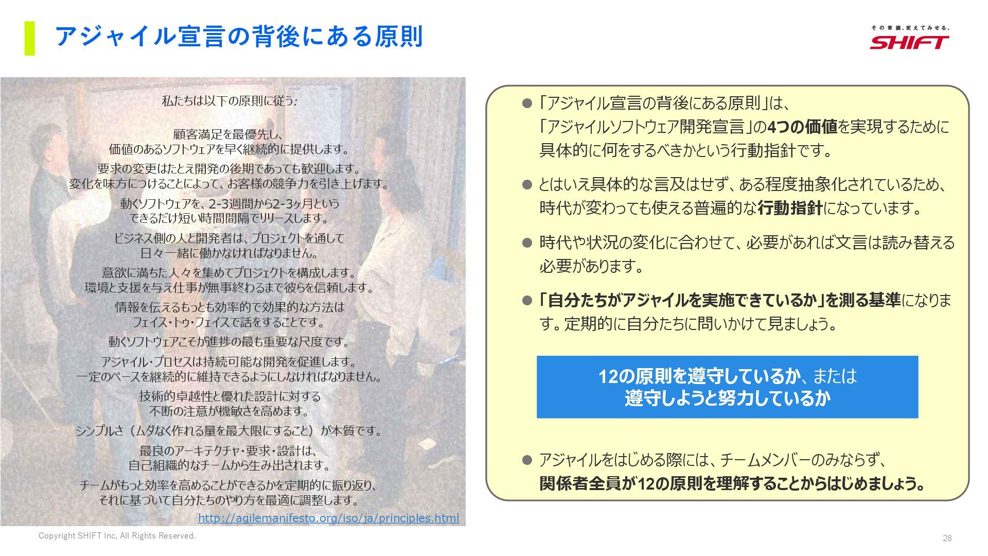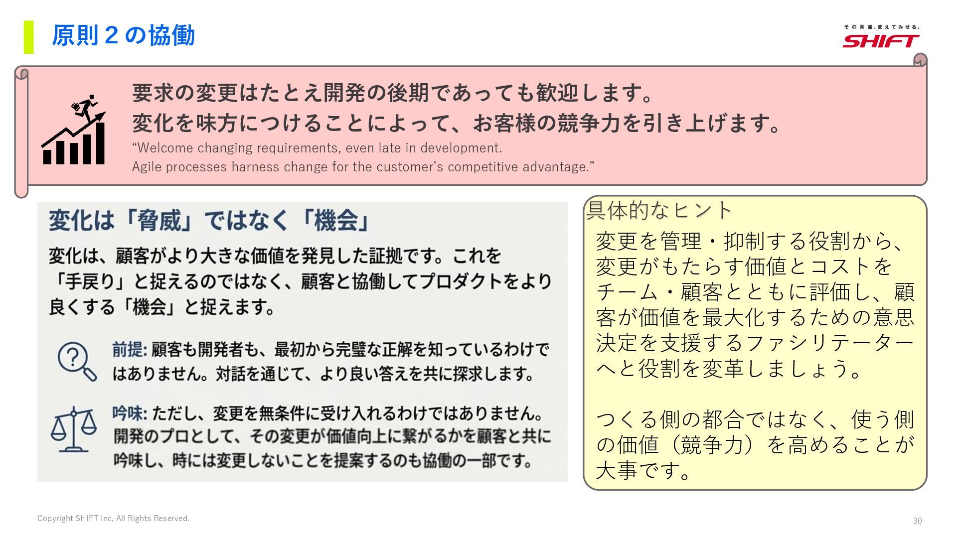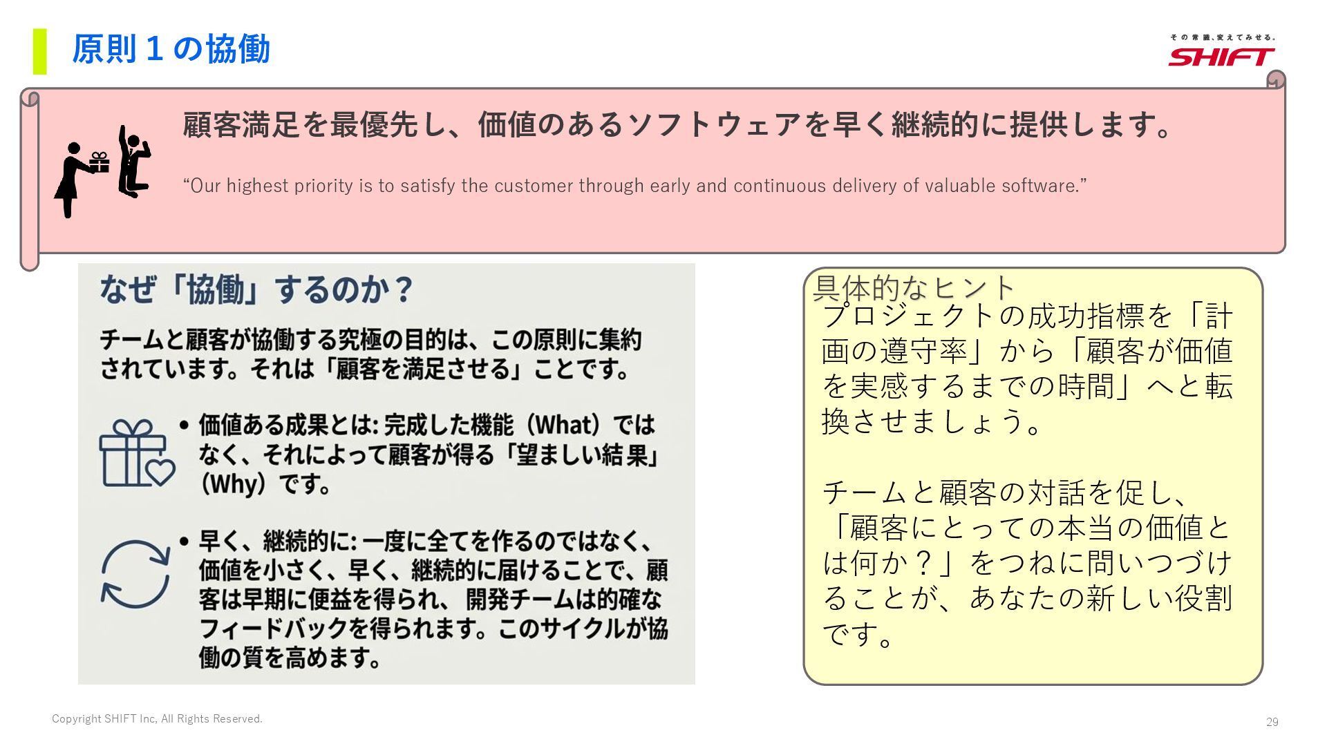 highest priority is to satisfy the customer through early and continuous delivery of valuable software.” プロジェクトの成功指標を「計 画の遵守率」から「顧客が価値 を実感するまでの時間」へと転 換させましょう。 チームと顧客の対話を促し、 「顧客にとっての本当の価値と は何か?」をつねに問いつづけ ることが、あなたの新しい役割 です。 具体的なヒント