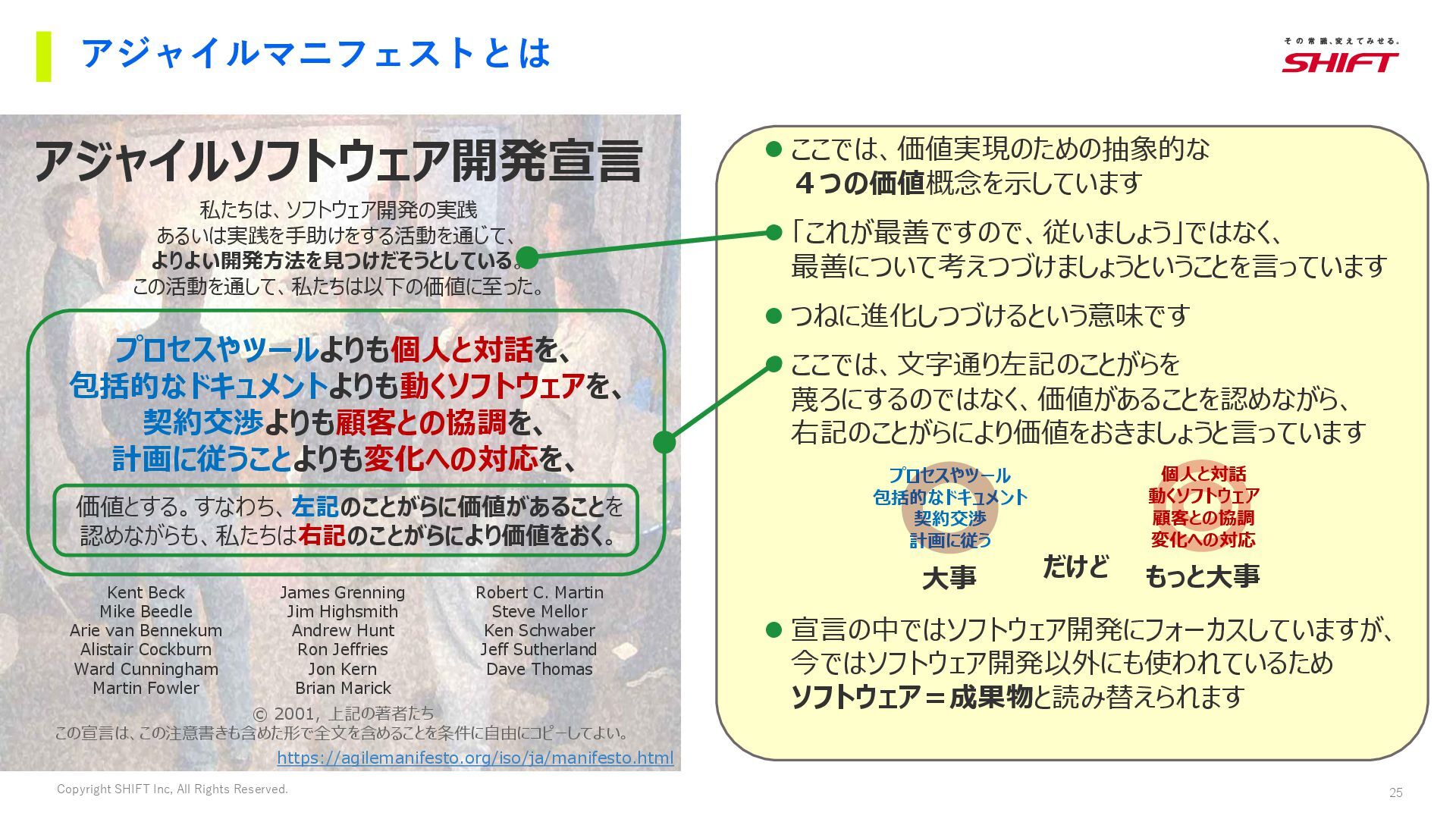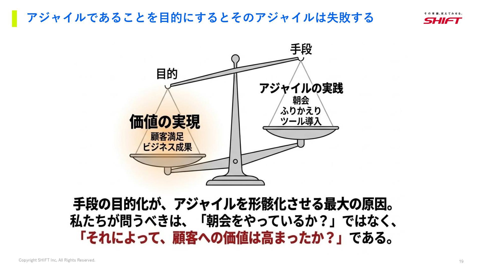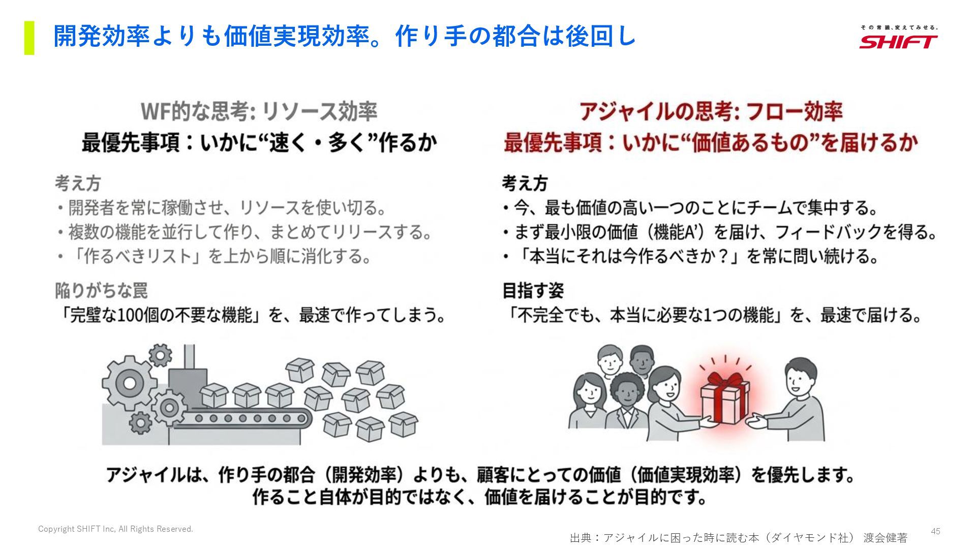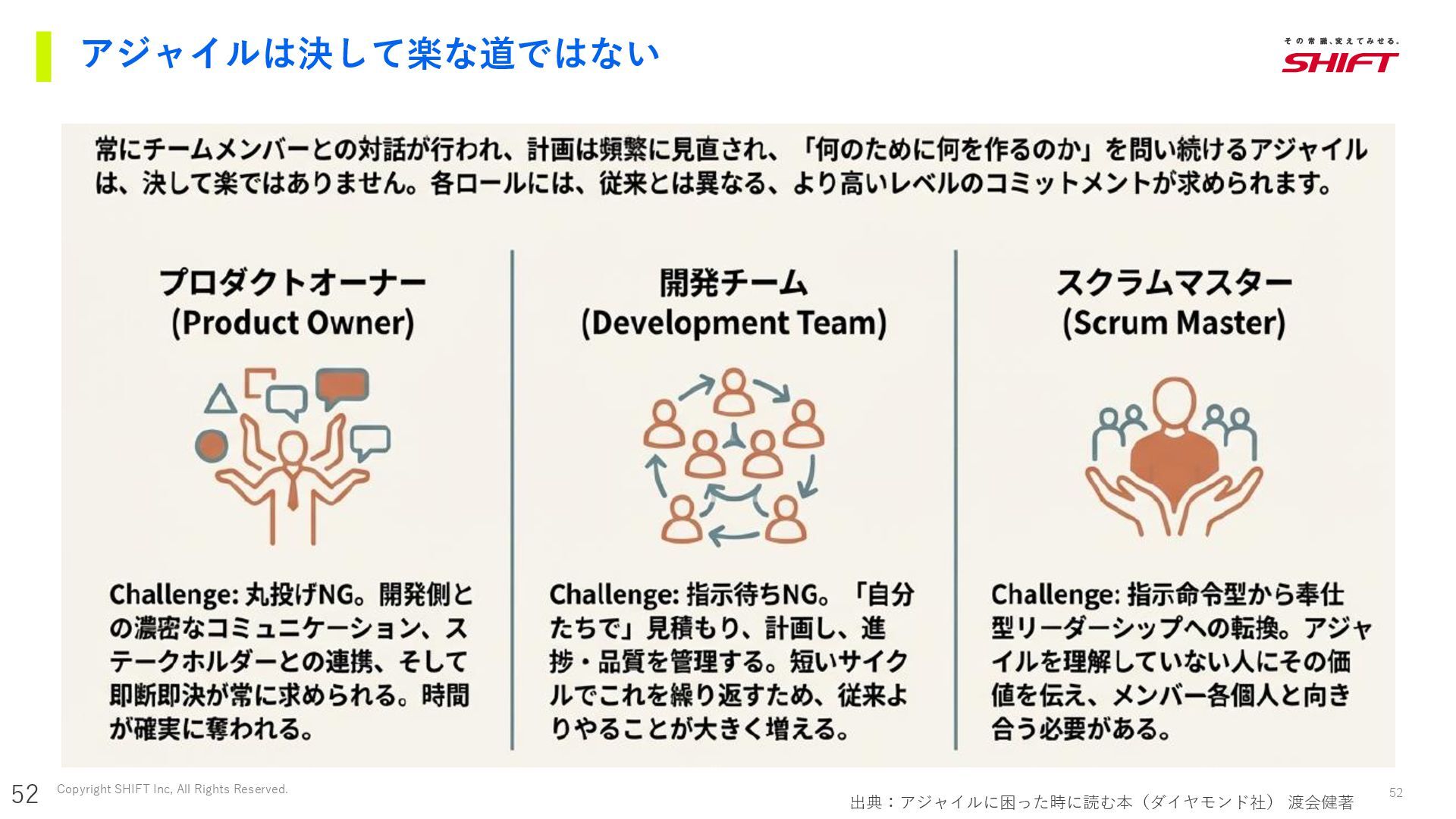 highest priority is to satisfy the customer through early and continuous delivery of valuable software.” プロジェクトの成功指標を「計 画の遵守率」から「顧客が価値 を実感するまでの時間」へと転 換させましょう。 チームと顧客の対話を促し、 「顧客にとっての本当の価値と は何か?」をつねに問いつづけ ることが、あなたの新しい役割 です。 具体的なヒント