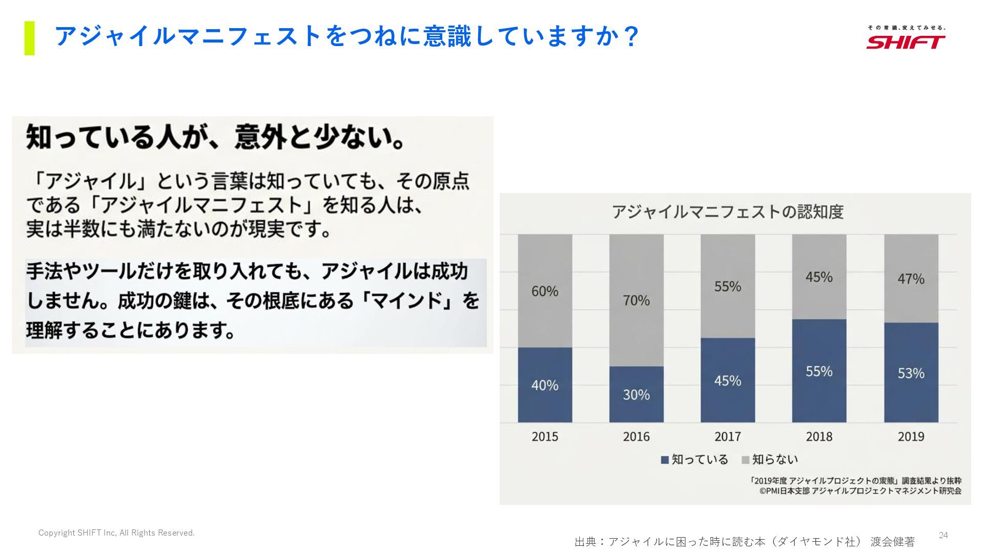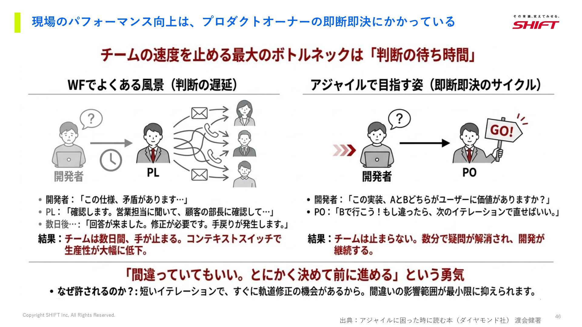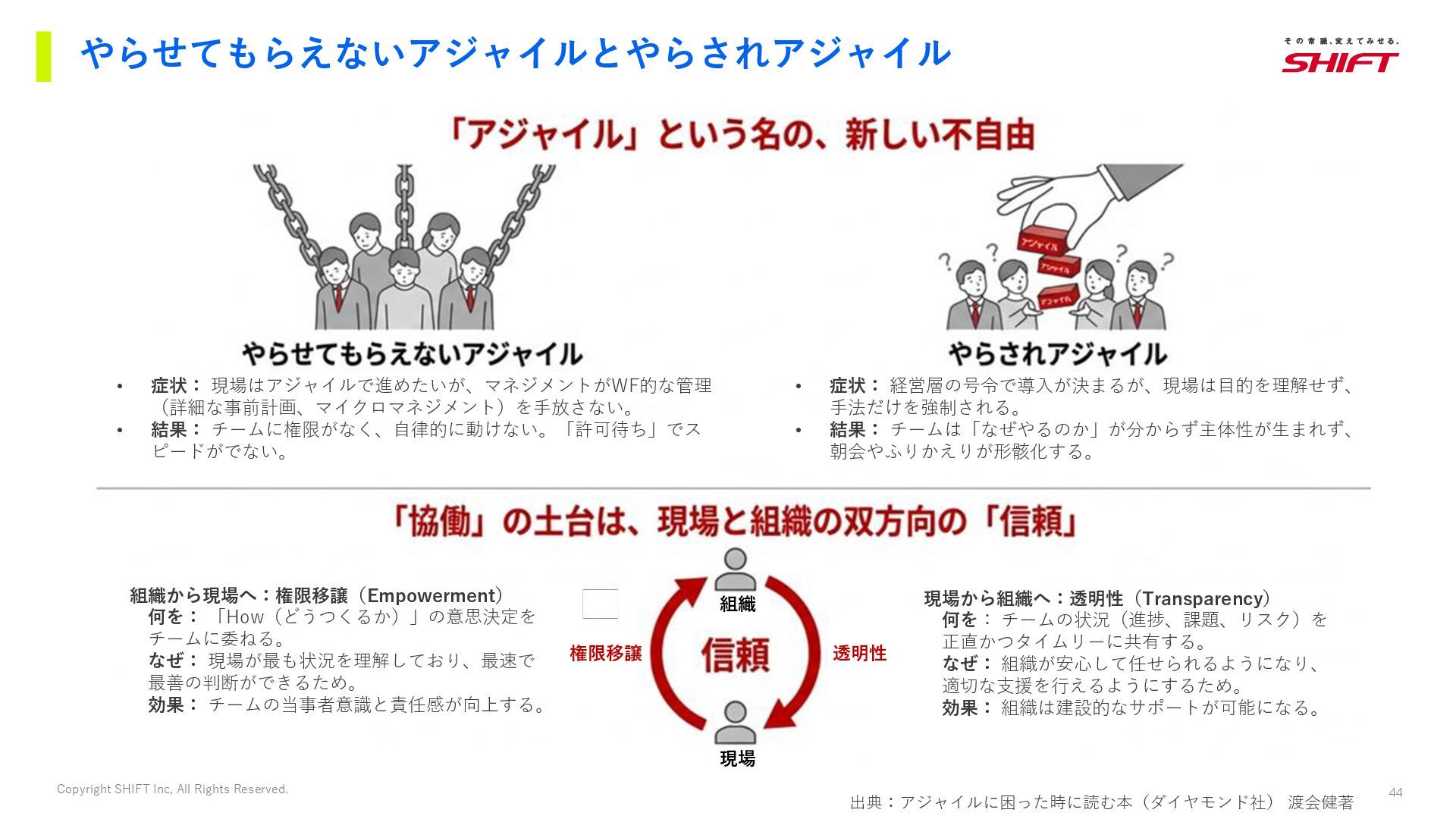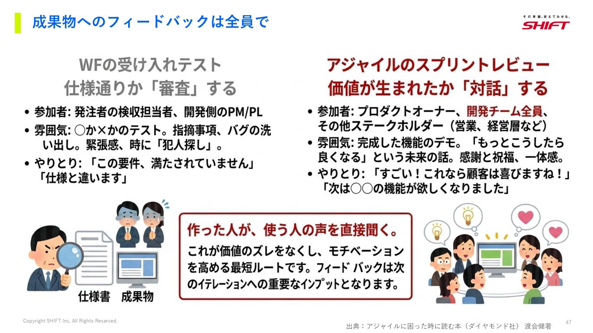 highest priority is to satisfy the customer through early and continuous delivery of valuable software.” プロジェクトの成功指標を「計 画の遵守率」から「顧客が価値 を実感するまでの時間」へと転 換させましょう。 チームと顧客の対話を促し、 「顧客にとっての本当の価値と は何か?」をつねに問いつづけ ることが、あなたの新しい役割 です。 具体的なヒント