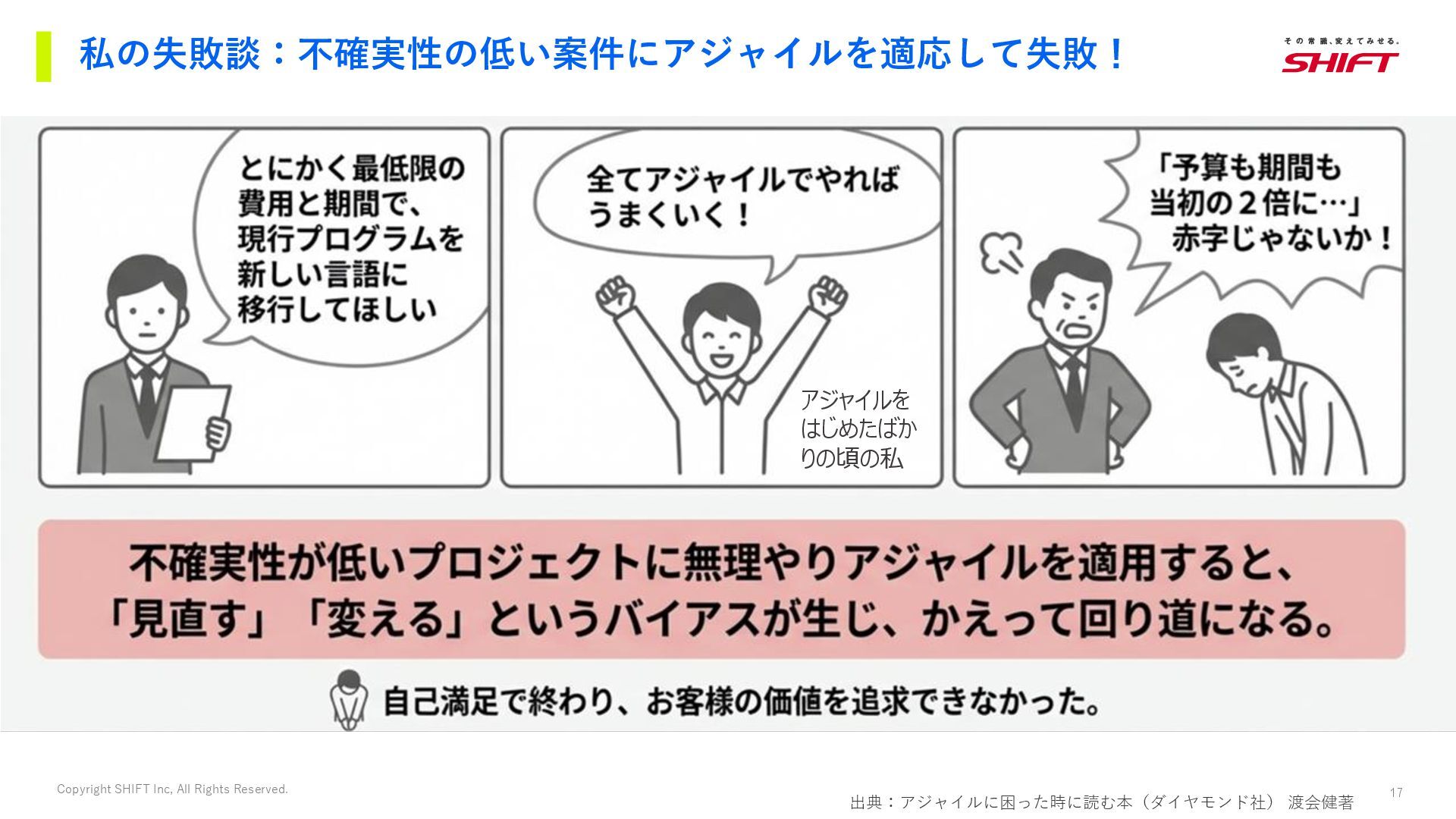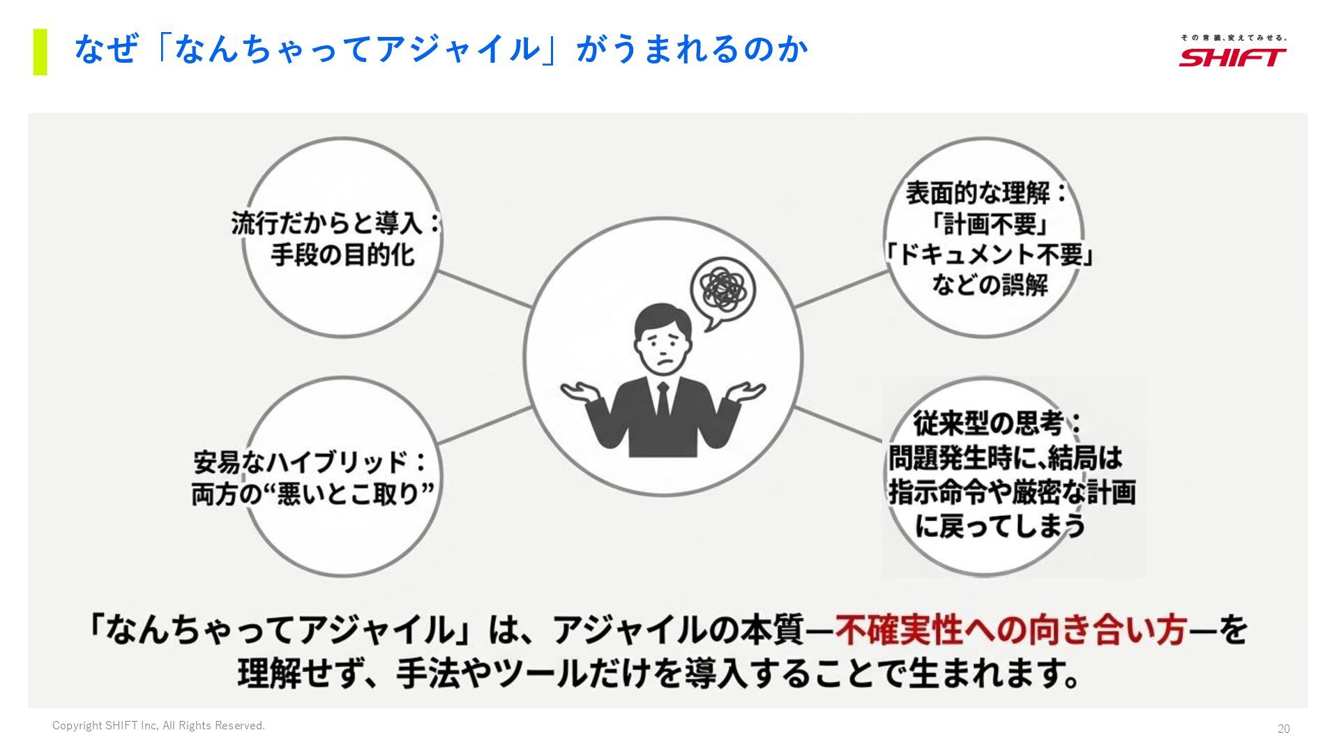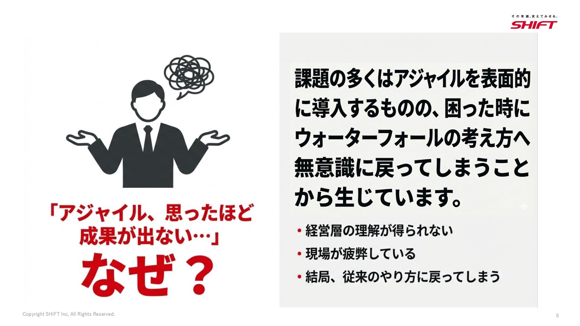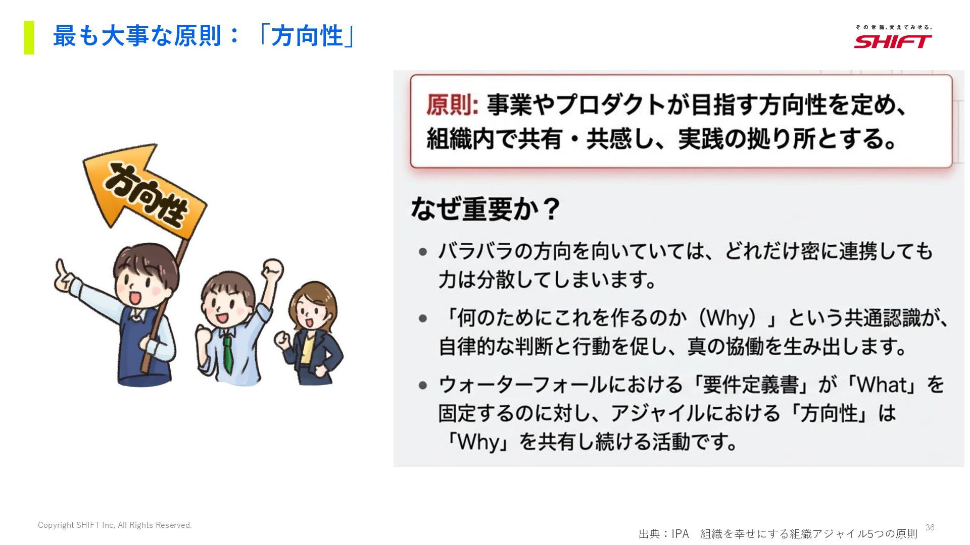 highest priority is to satisfy the customer through early and continuous delivery of valuable software.” プロジェクトの成功指標を「計 画の遵守率」から「顧客が価値 を実感するまでの時間」へと転 換させましょう。 チームと顧客の対話を促し、 「顧客にとっての本当の価値と は何か?」をつねに問いつづけ ることが、あなたの新しい役割 です。 具体的なヒント
