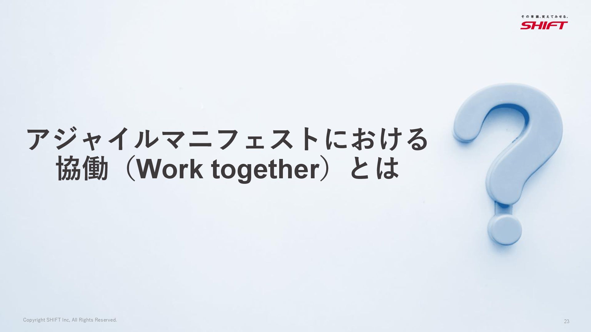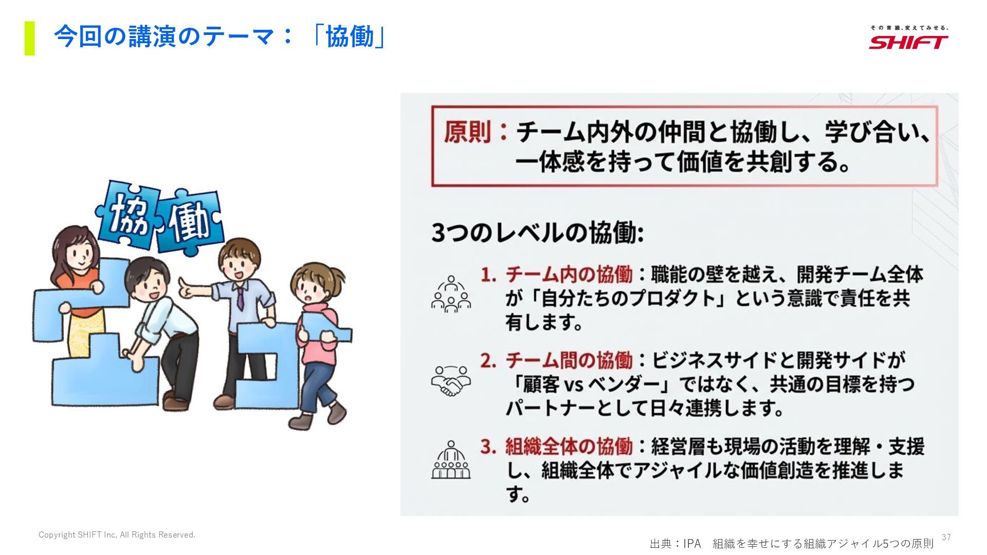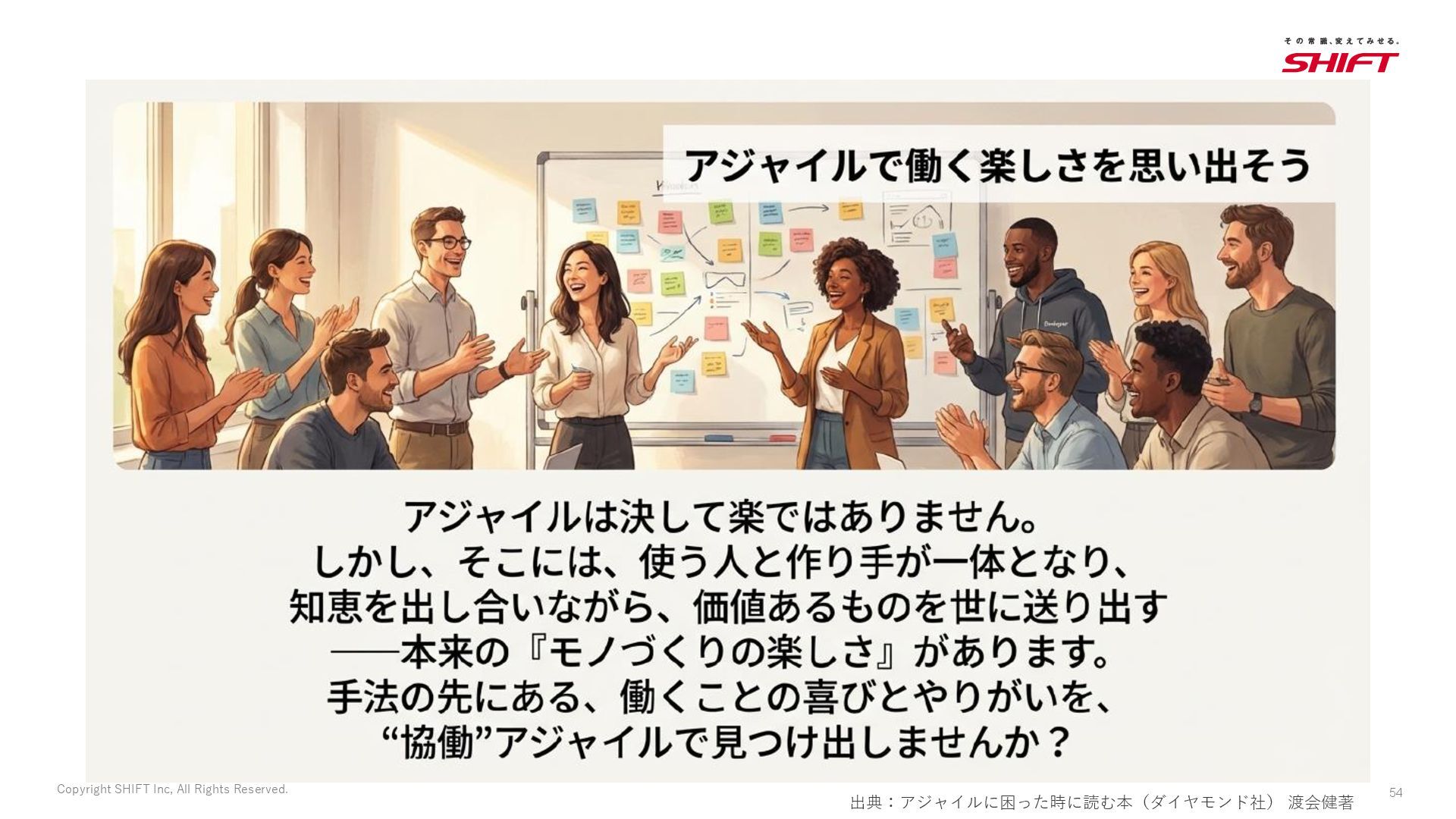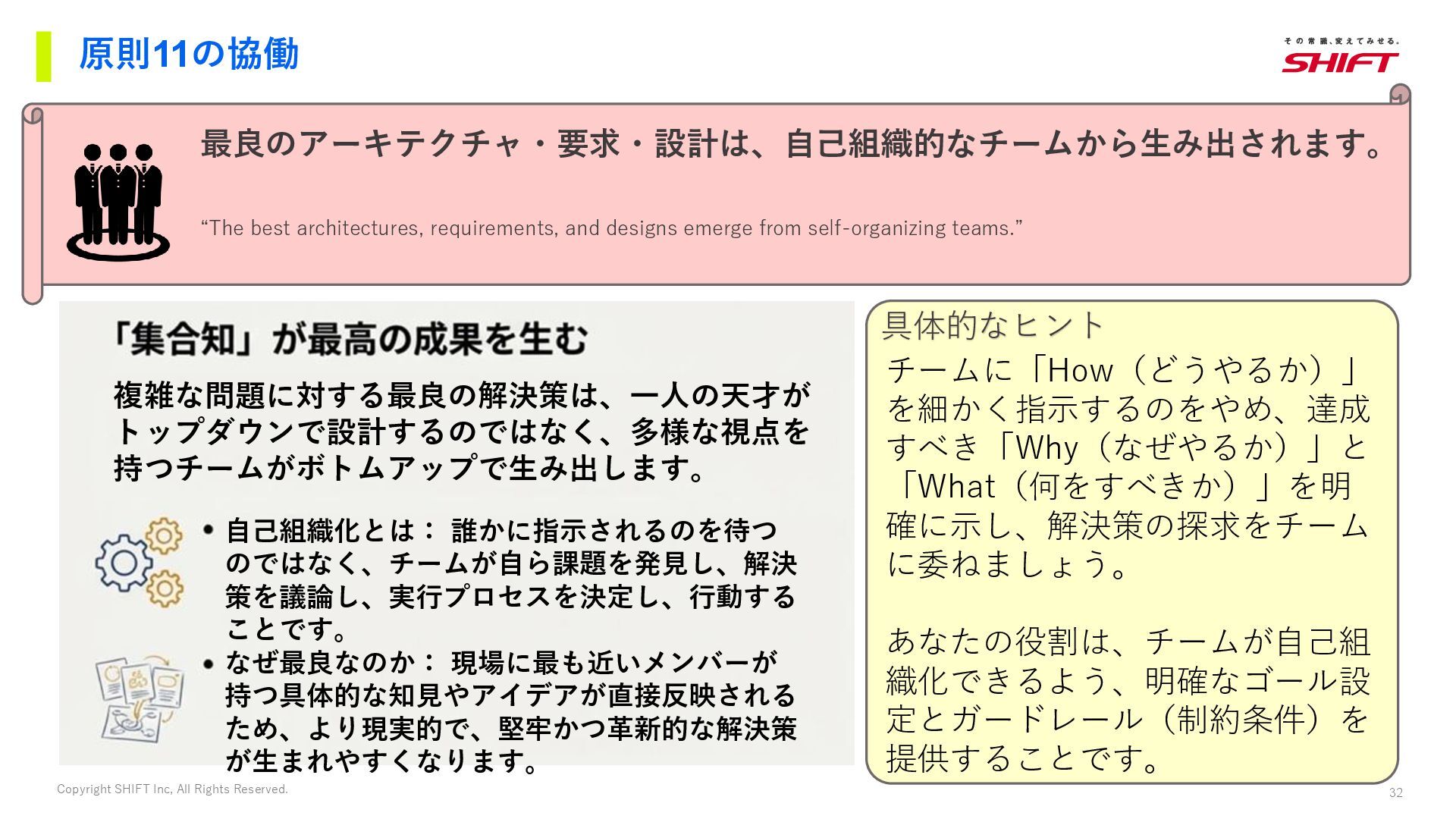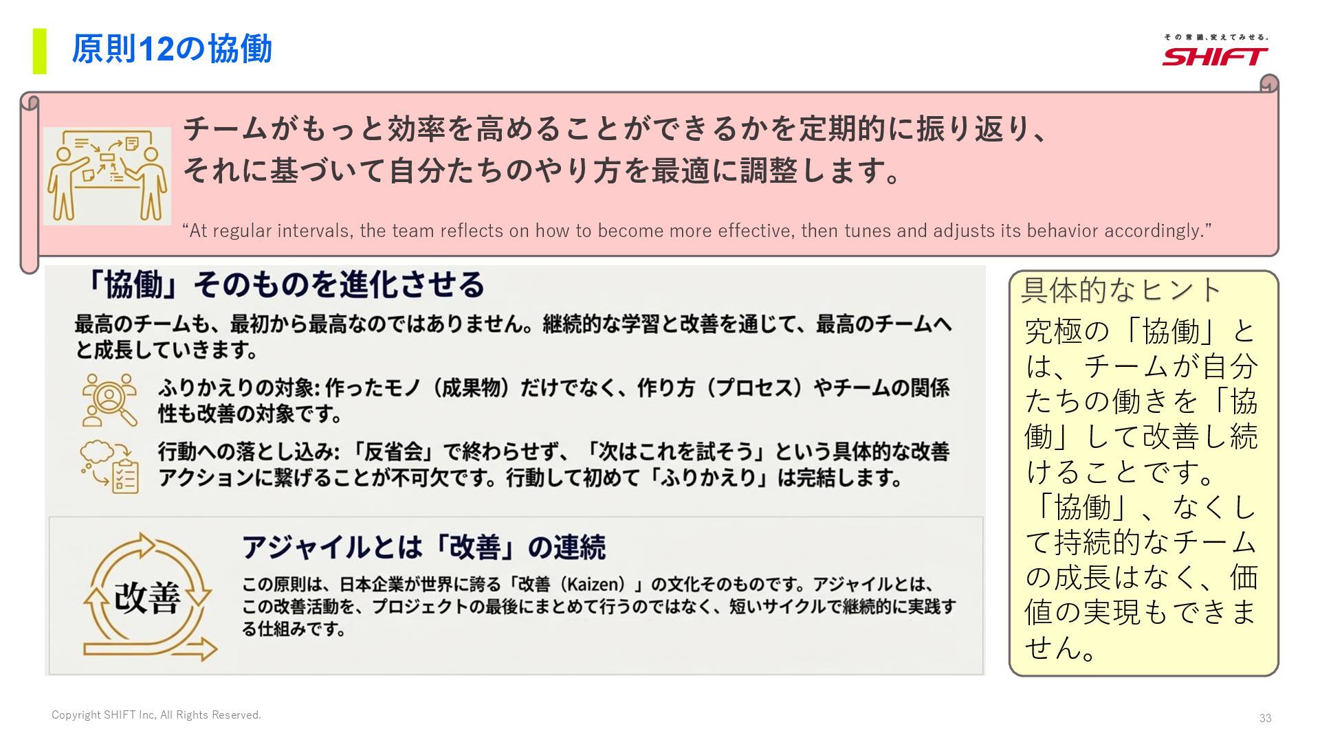 “At regular intervals, the team reflects on how to become more effective, then tunes and adjusts its behavior accordingly.” 究極の「協働」と は、チームが自分 たちの働きを「協 働」して改善し続 けることです。 「協働」、なくし て持続的なチーム の成長はなく、価 値の実現もできま せん。 具体的なヒント