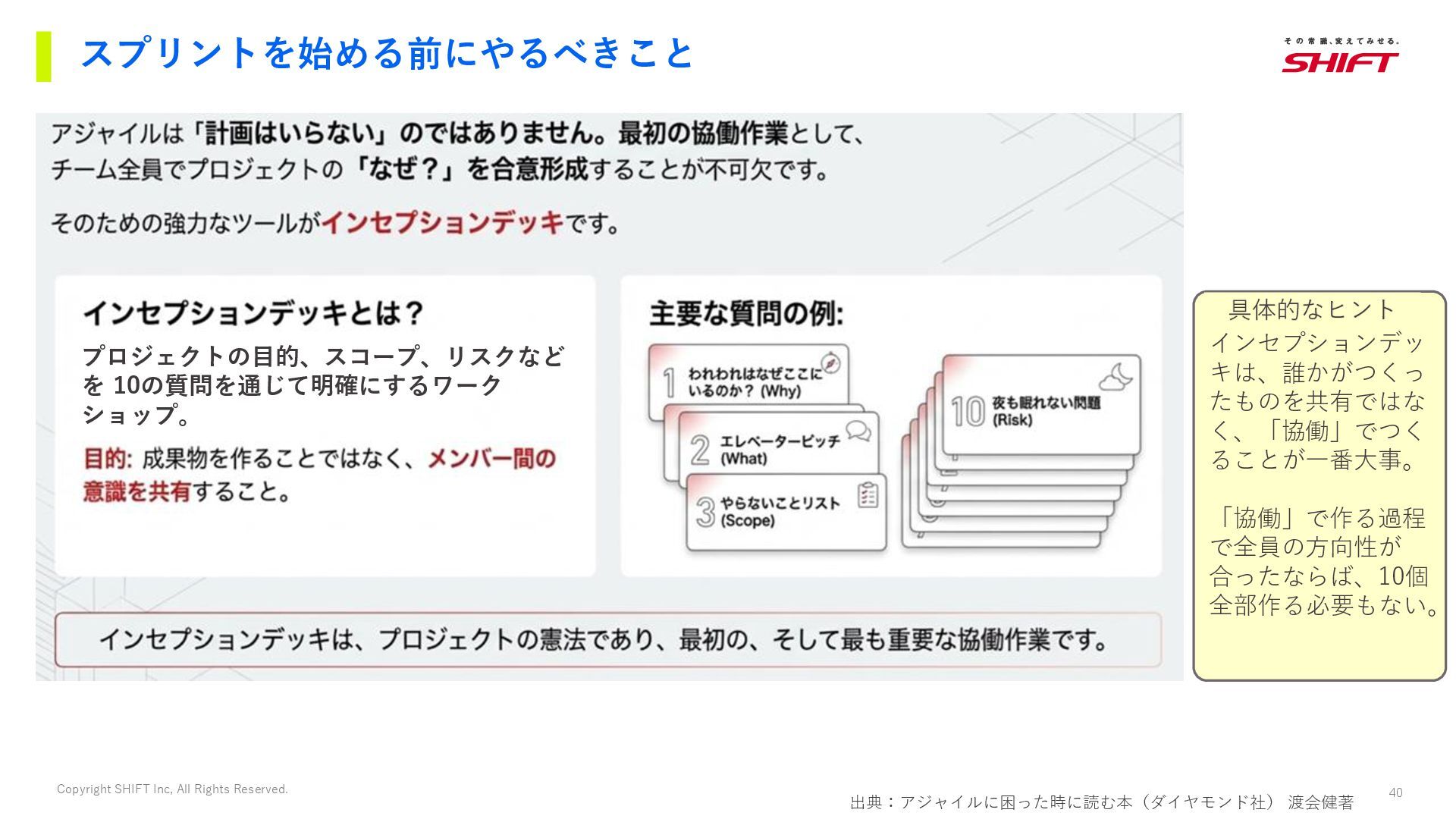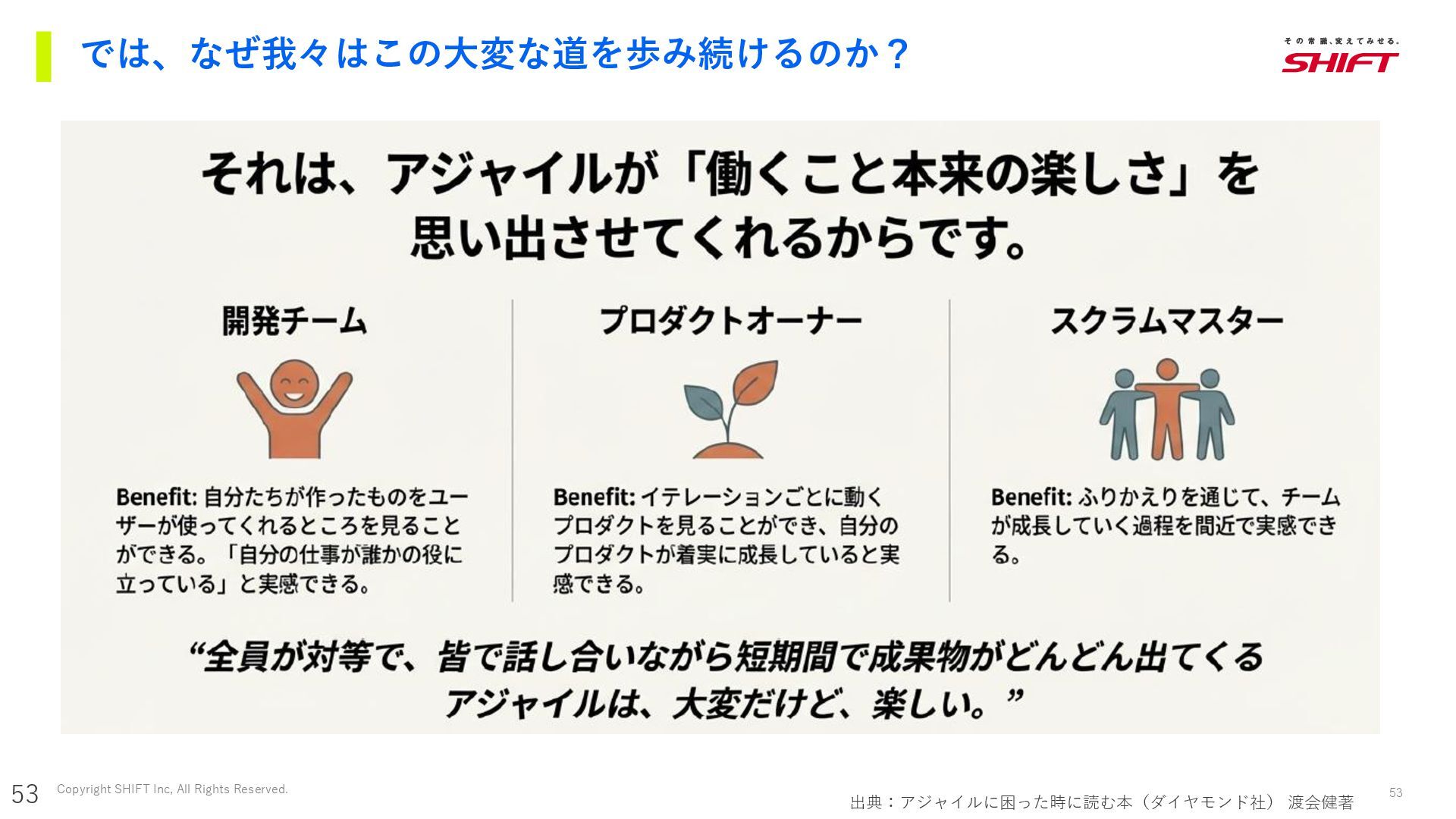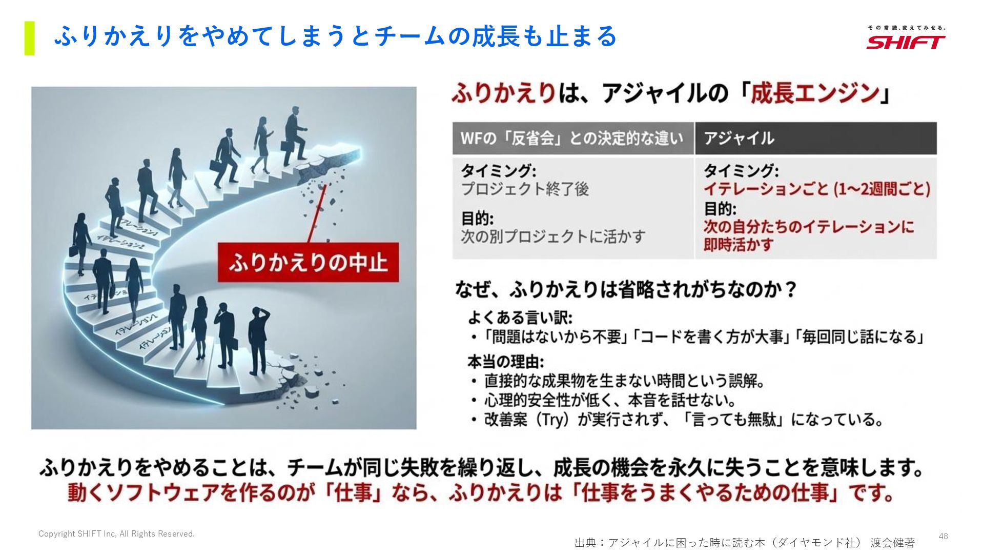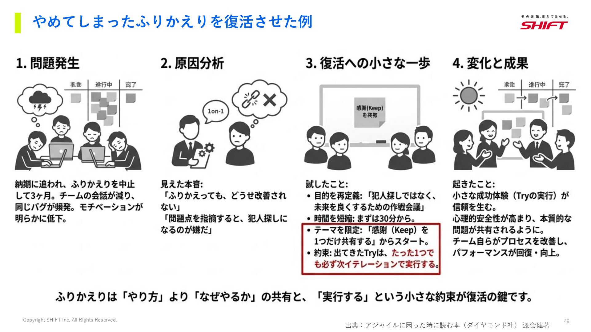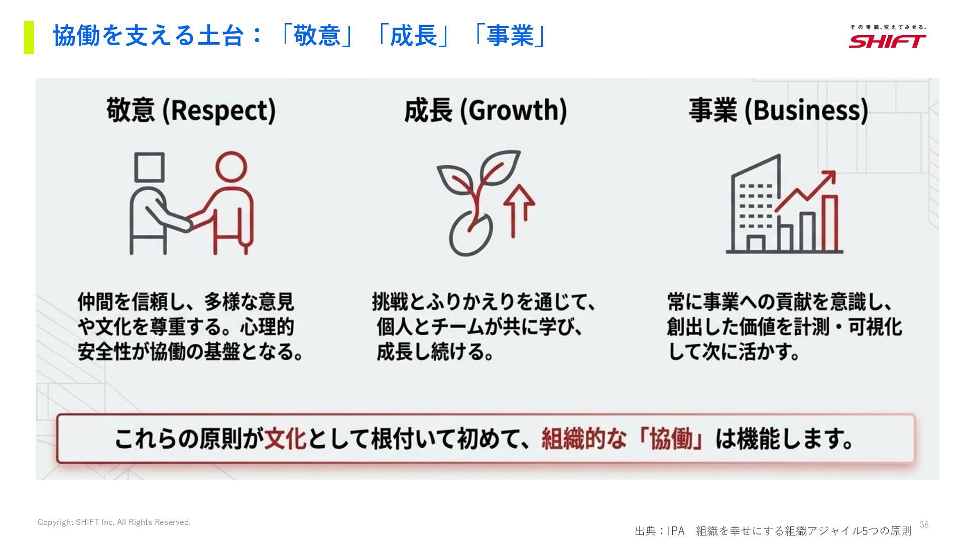 “At regular intervals, the team reflects on how to become more effective, then tunes and adjusts its behavior accordingly.” 究極の「協働」と は、チームが自分 たちの働きを「協 働」して改善し続 けることです。 「協働」、なくし て持続的なチーム の成長はなく、価 値の実現もできま せん。 具体的なヒント