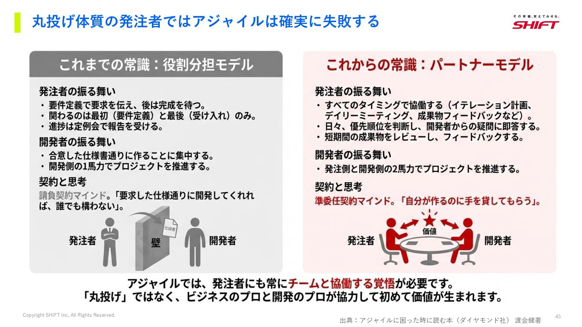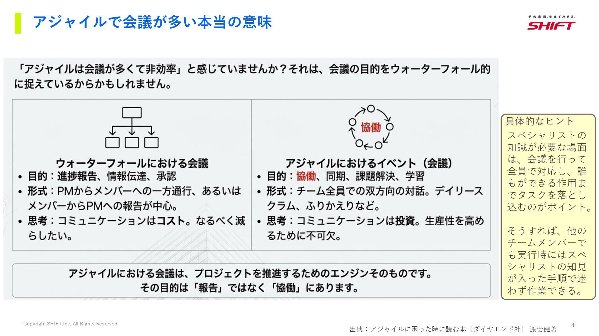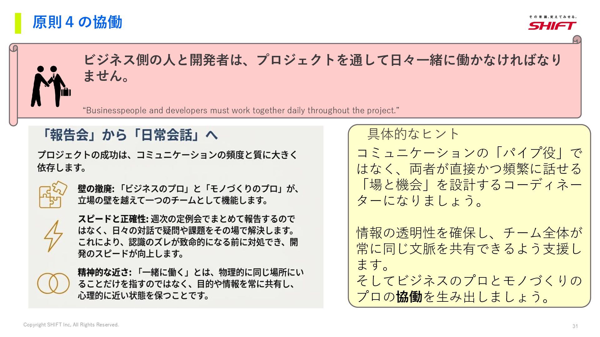 “Businesspeople and developers must work together daily throughout the project.” コミュニケーションの「パイプ役」で はなく、両者が直接かつ頻繁に話せる 「場と機会」を設計するコーディネー ターになりましょう。 情報の透明性を確保し、チーム全体が 常に同じ文脈を共有できるよう支援し ます。 そしてビジネスのプロとモノづくりの プロの協働を生み出しましょう。 具体的なヒント