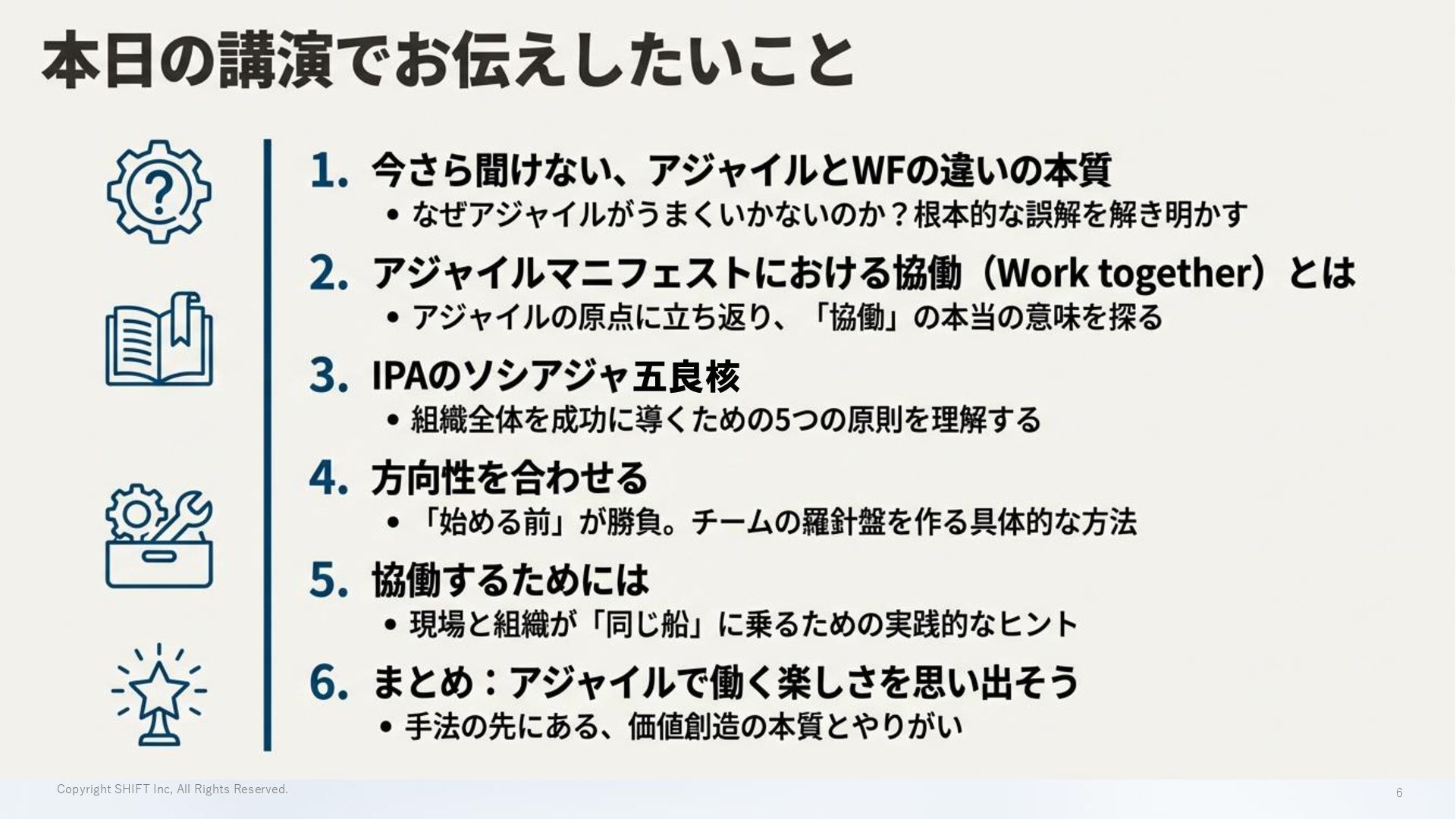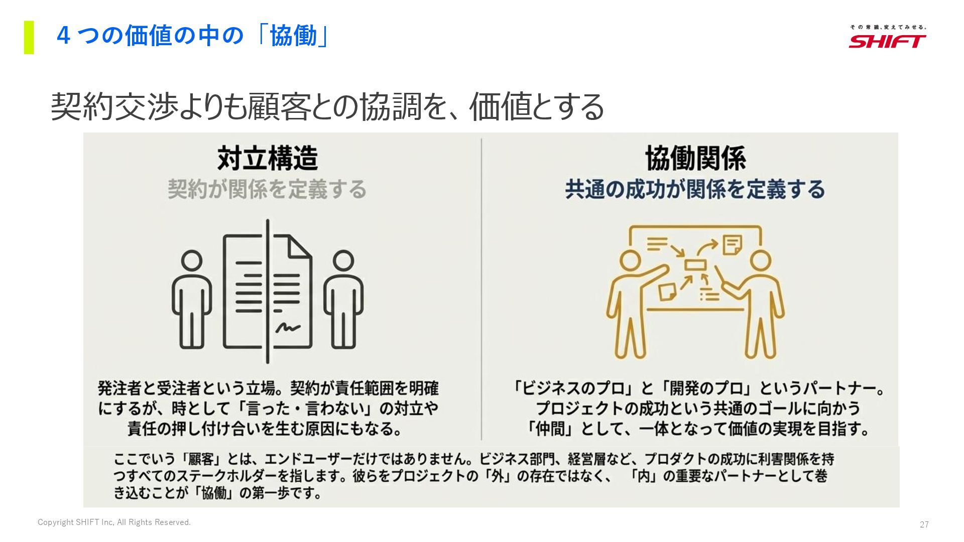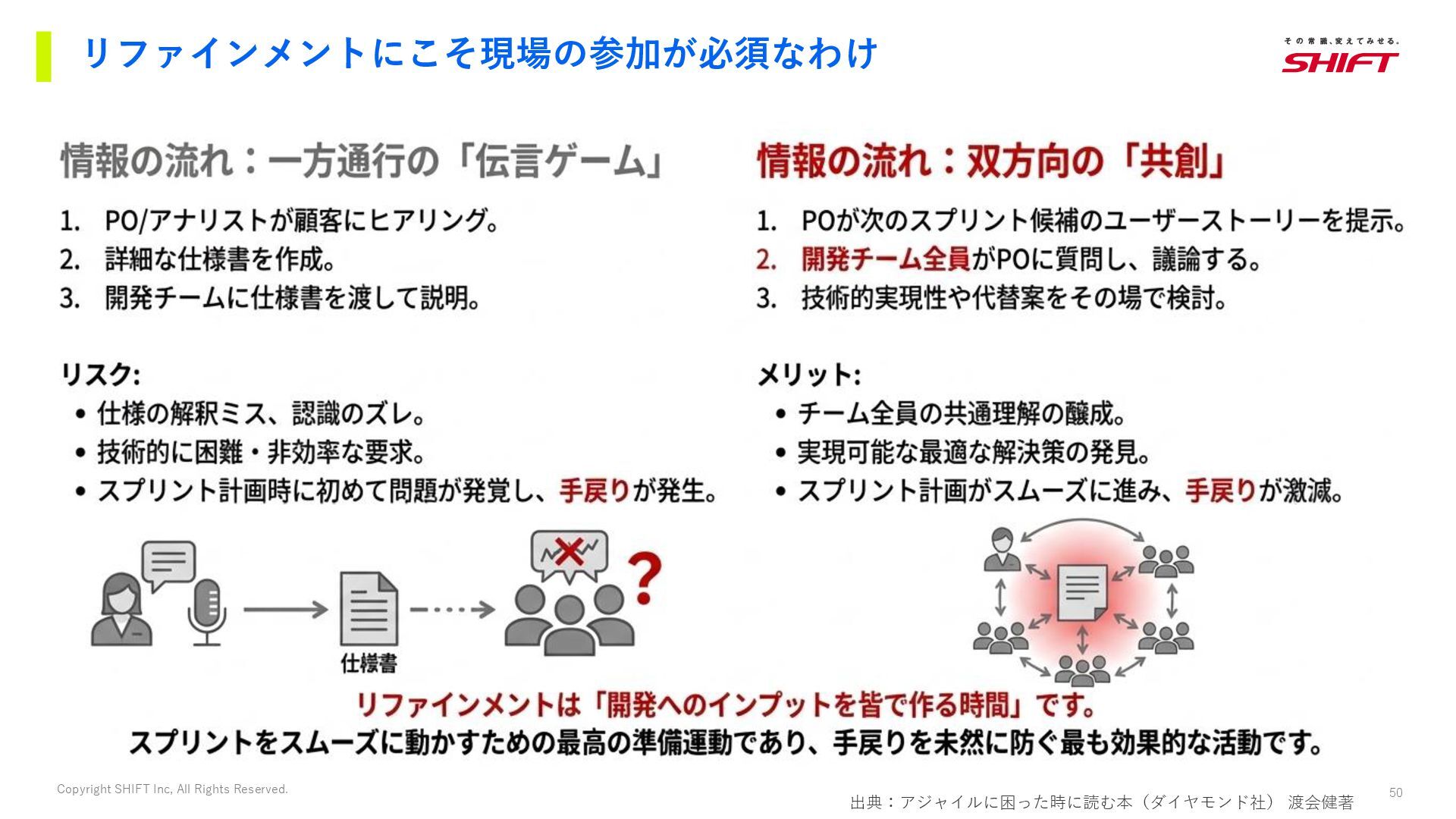 “Businesspeople and developers must work together daily throughout the project.” コミュニケーションの「パイプ役」で はなく、両者が直接かつ頻繁に話せる 「場と機会」を設計するコーディネー ターになりましょう。 情報の透明性を確保し、チーム全体が 常に同じ文脈を共有できるよう支援し ます。 そしてビジネスのプロとモノづくりの プロの協働を生み出しましょう。 具体的なヒント