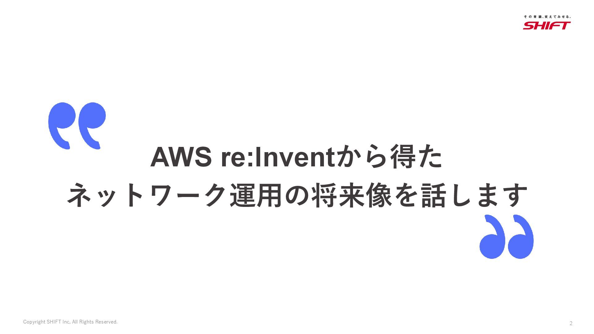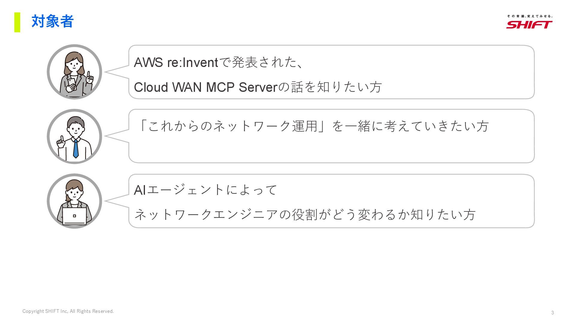 2. 3 Copyright SHIFT Inc, All Rights Reserved. 対象者 「これからのネットワーク運用」を一緒に考えていきたい方 AWS