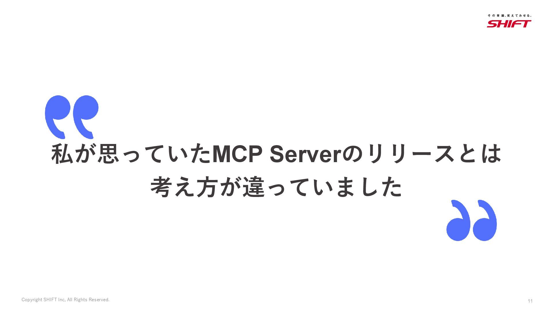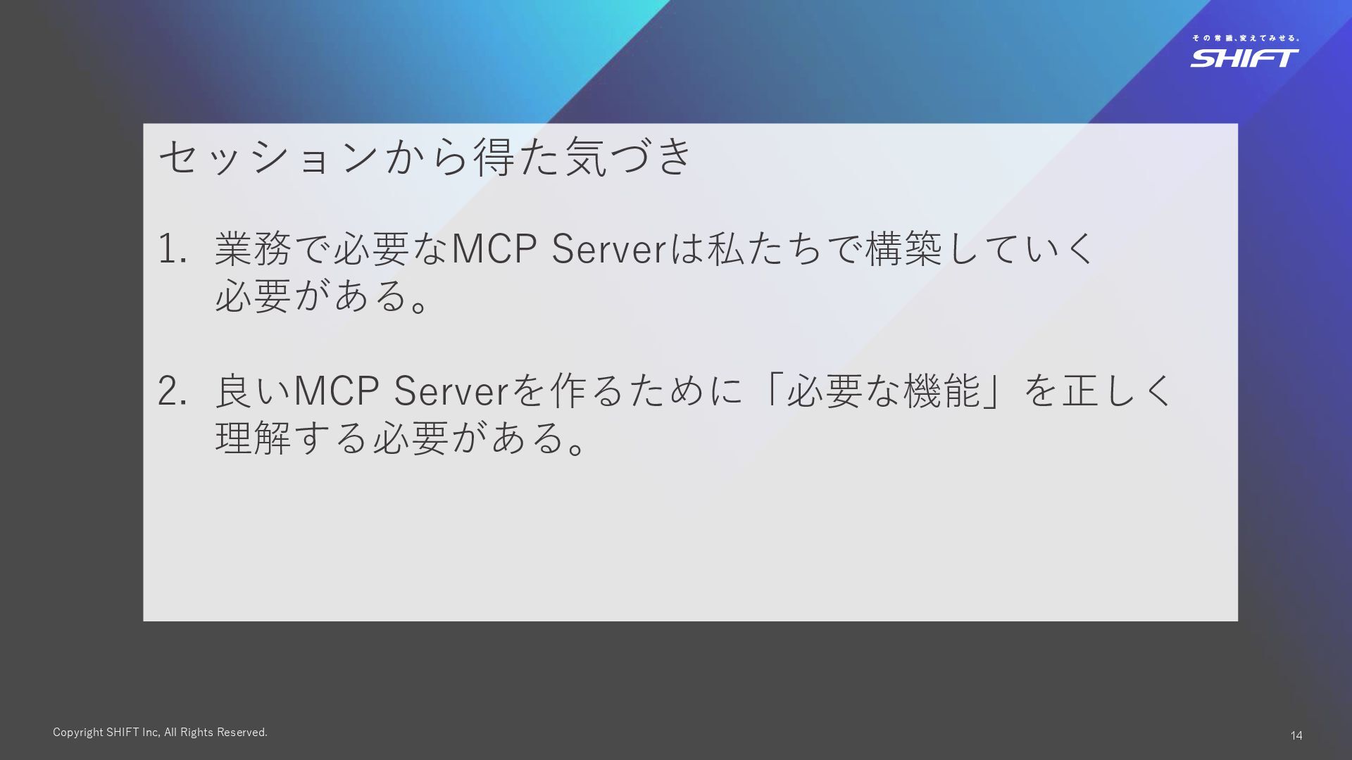 10. Copyright SHIFT Inc, All Rights Reserved. 14 セッションから得た気づき 1. 業務で必要なMCP