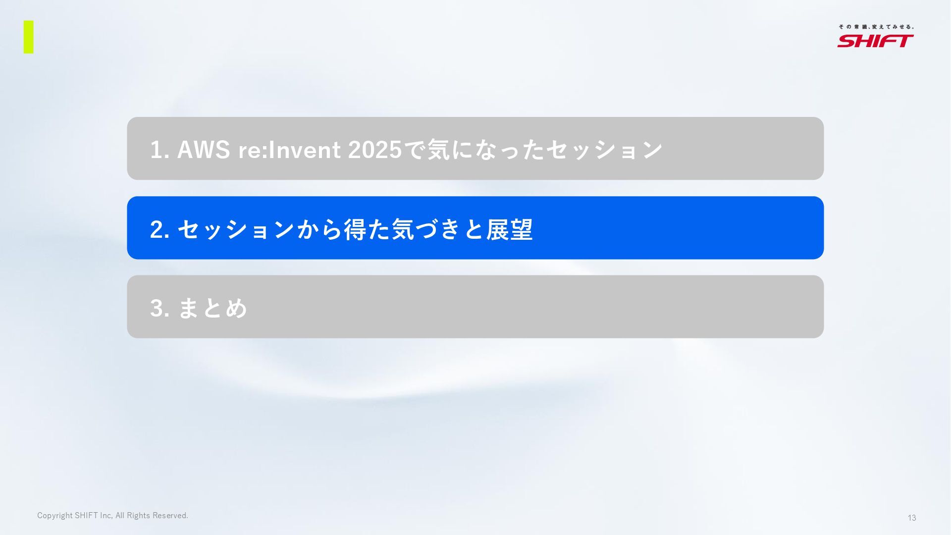 9. 13 Copyright SHIFT Inc, All Rights Reserved. 1. AWS re:Invent