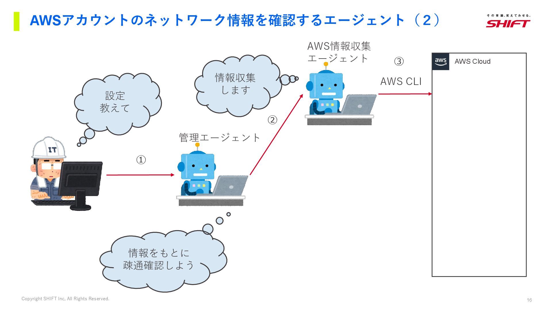 11. 16 Copyright SHIFT Inc, All Rights Reserved. AWSアカウントのネットワーク情報を確認するエージェント(2) 設定 教えて
