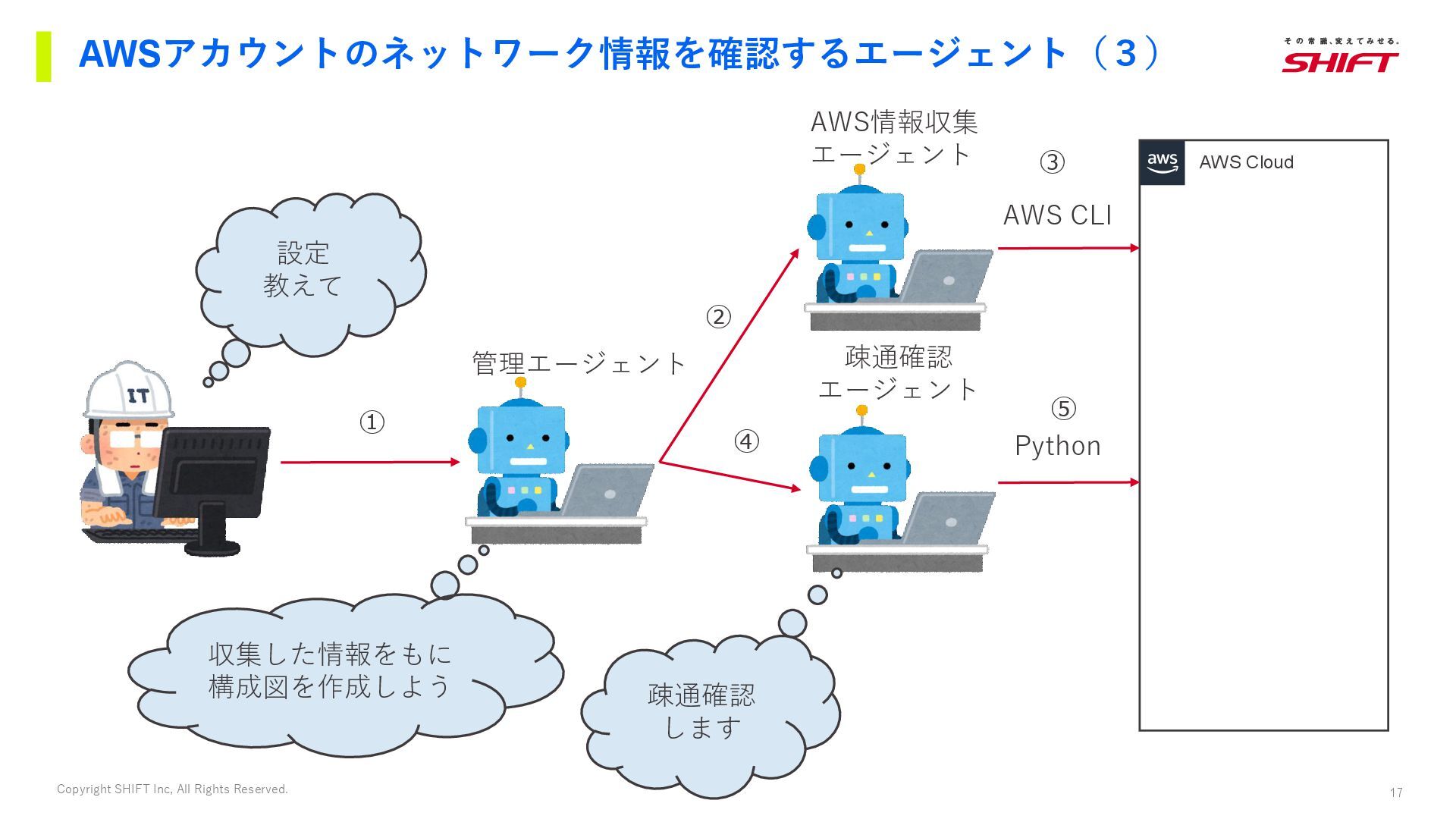 AWS Cloud 管理エージェント AWS情報収集 エージェント AWS CLI 疎通確認 エージェント Python 疎通確認 します 収集した情報をもに 構成図を作成しよう ① ② ③ ④ ⑤