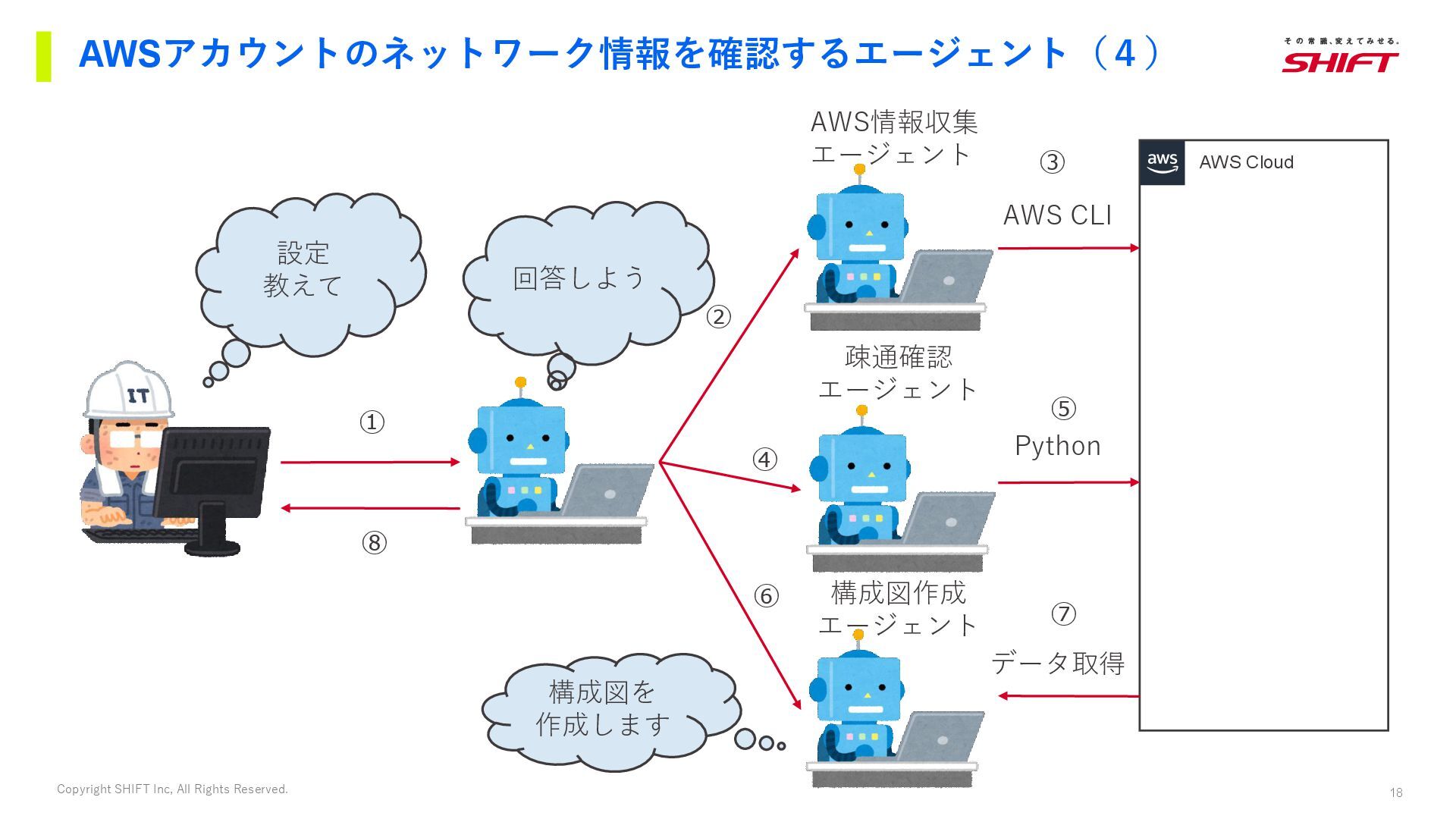 AWS Cloud 構成図作成 エージェント 構成図を 作成します データ取得 AWS情報収集 エージェント AWS CLI 疎通確認 エージェント Python 回答しよう ① ② ③ ⑥ ⑤ ④ ⑦ ⑧