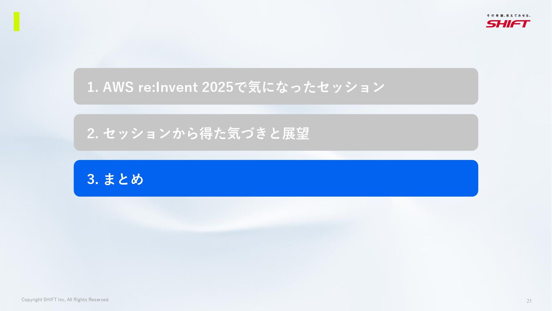 16. 21 Copyright SHIFT Inc, All Rights Reserved. 1. AWS re:Invent