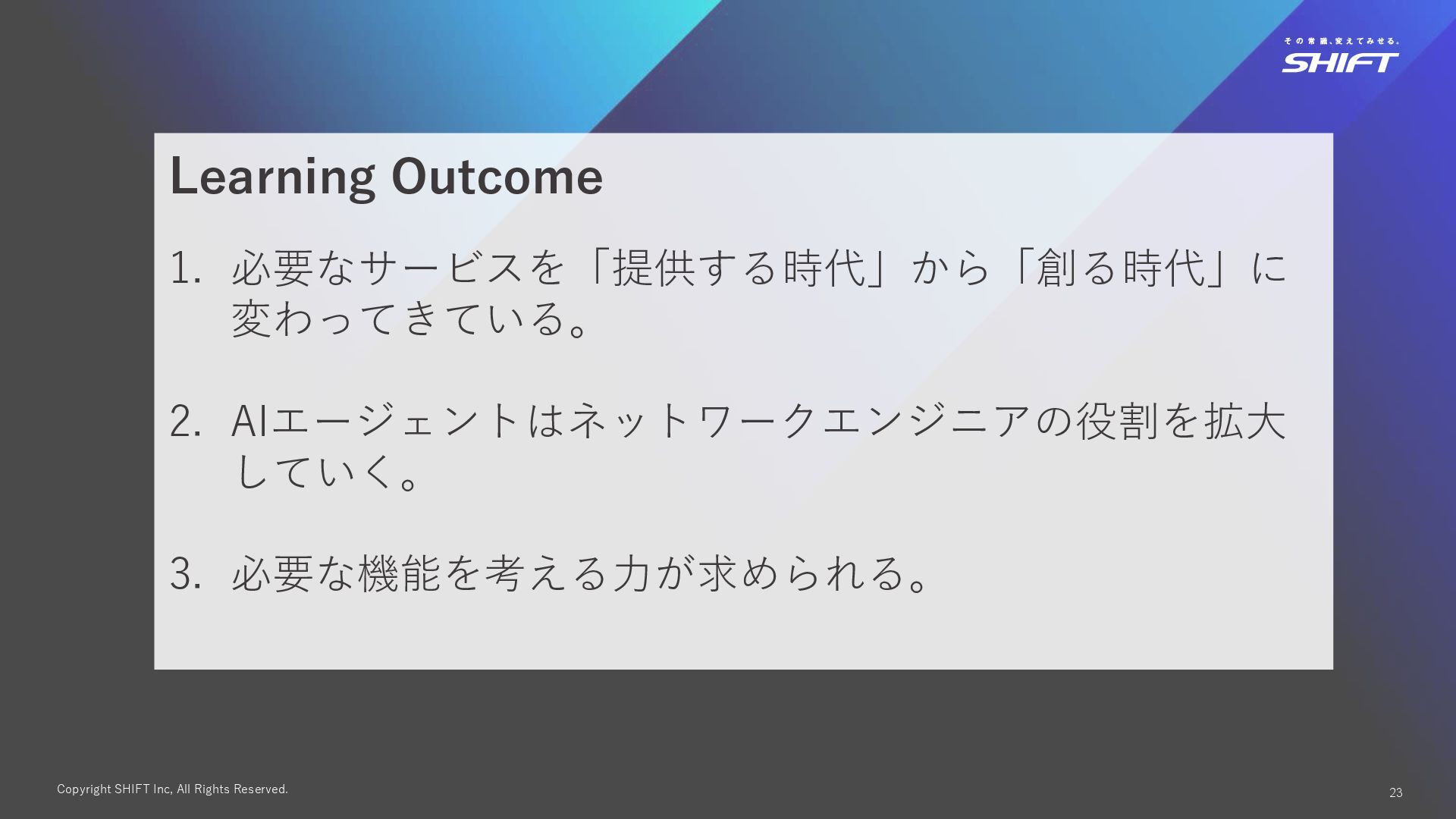 18. Copyright SHIFT Inc, All Rights Reserved. 23 Learning Outcome 1.