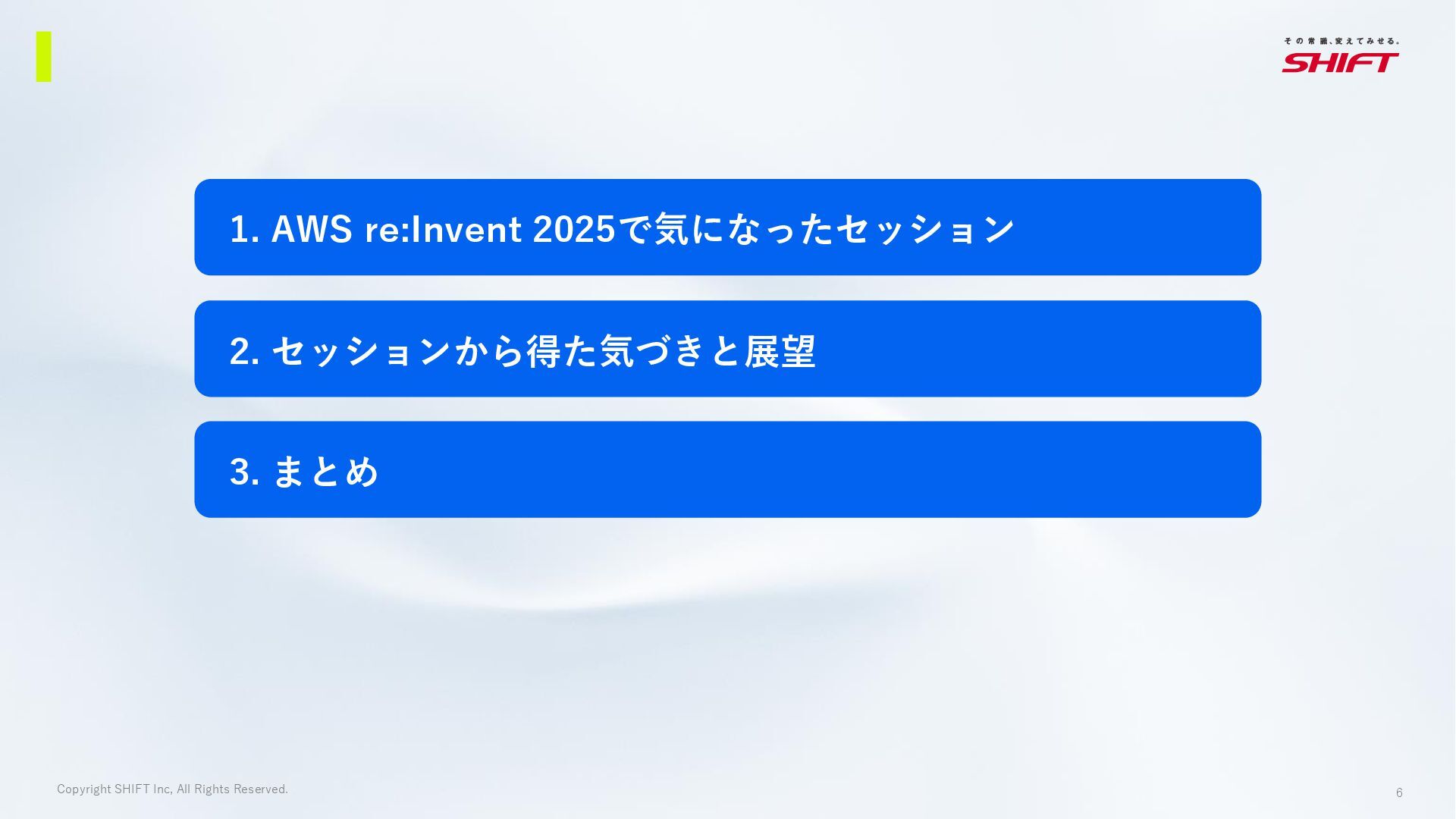 5. 6 Copyright SHIFT Inc, All Rights Reserved. 1. AWS re:Invent
