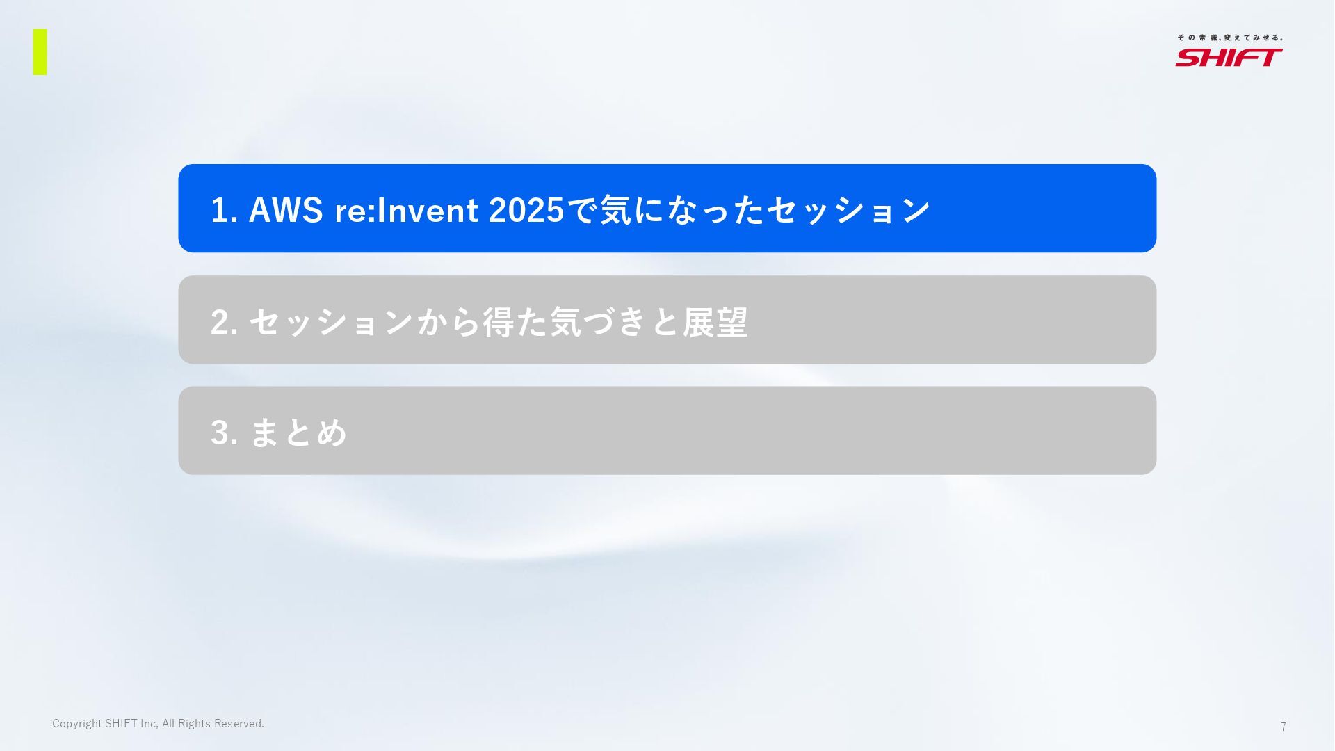 6. 7 Copyright SHIFT Inc, All Rights Reserved. 2. セッションから得た気づきと展望 3.
