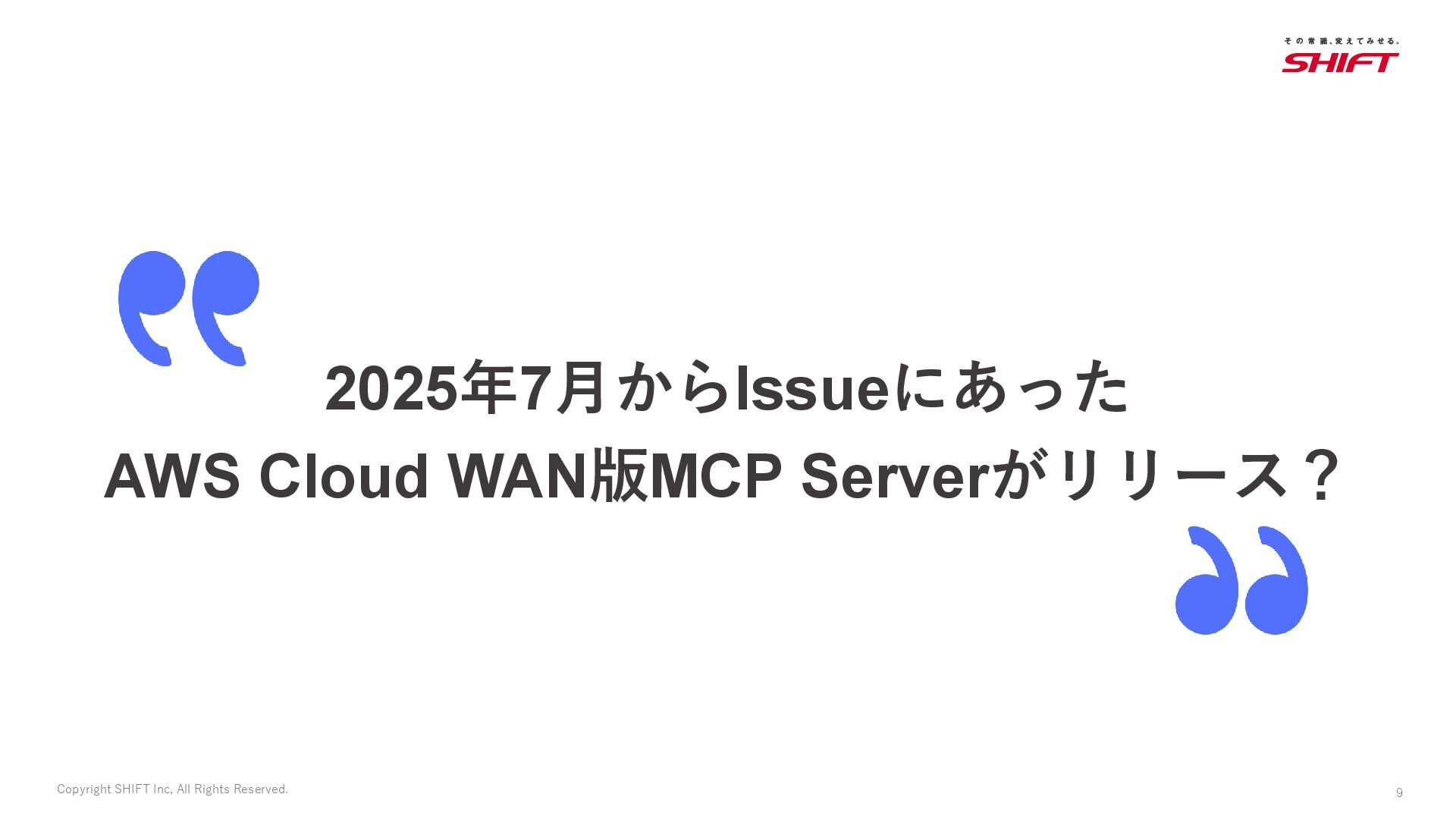 Inc, All Rights Reserved. 1 JAWS-UG 茨城 #10 大年末LT大会! 株式会社SHIFT アジャイル推進部 Okuda Masaki 28 12 15:10-15:20 奥田 雅基 Cloud WAN MCP Serverから考える 新しいネットワーク運用
