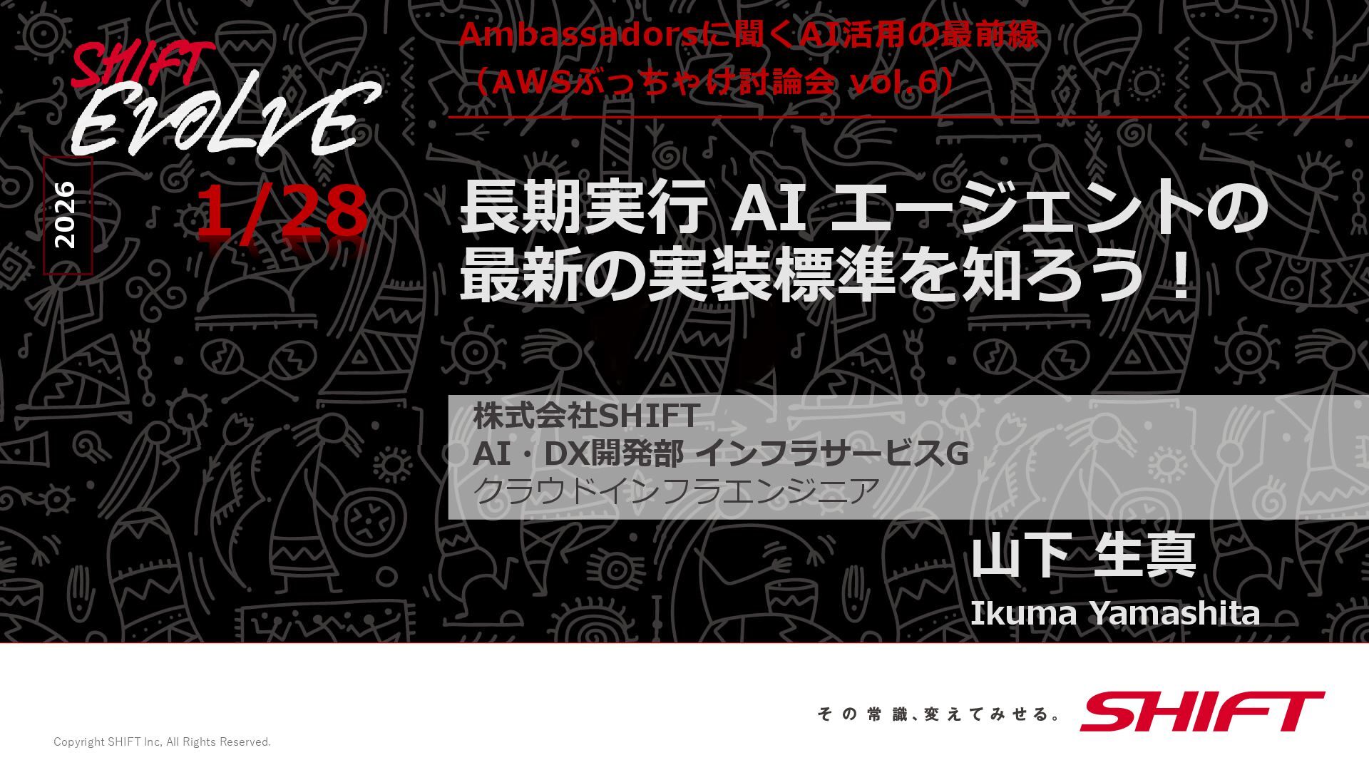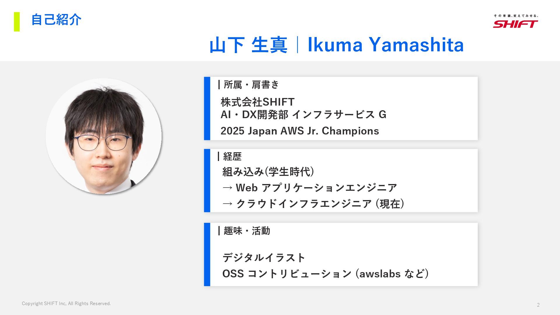 Yamashita 株式会社SHIFT AI・DX開発部 インフラサービス G 2025 Japan AWS Jr. Champions 組み込み(学生時代) → Web アプリケーションエンジニア → クラウドインフラエンジニア (現在) デジタルイラスト OSS コントリビューション (awslabs など) ┃経歴 ┃趣味・活動 ┃所属・肩書き