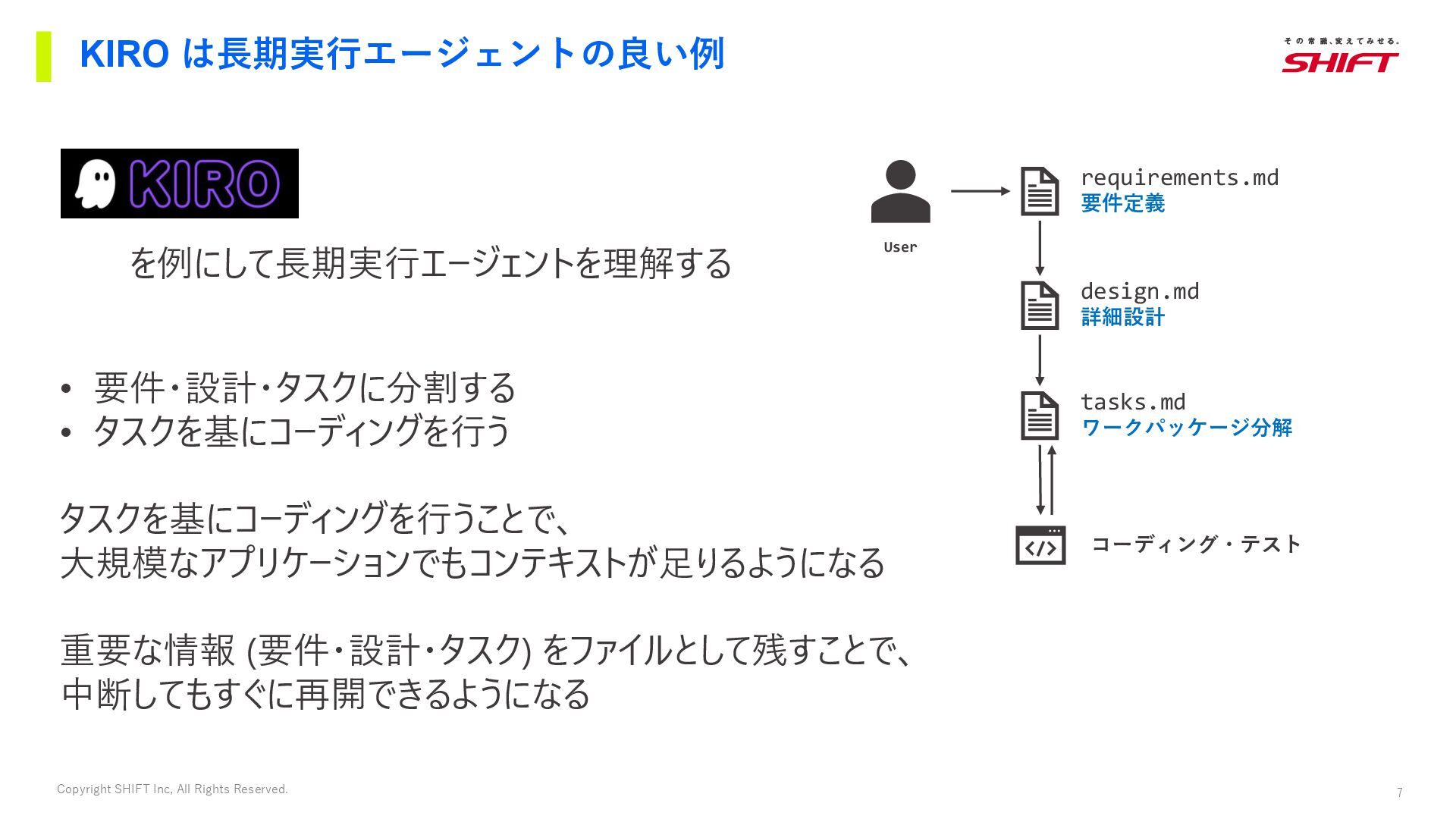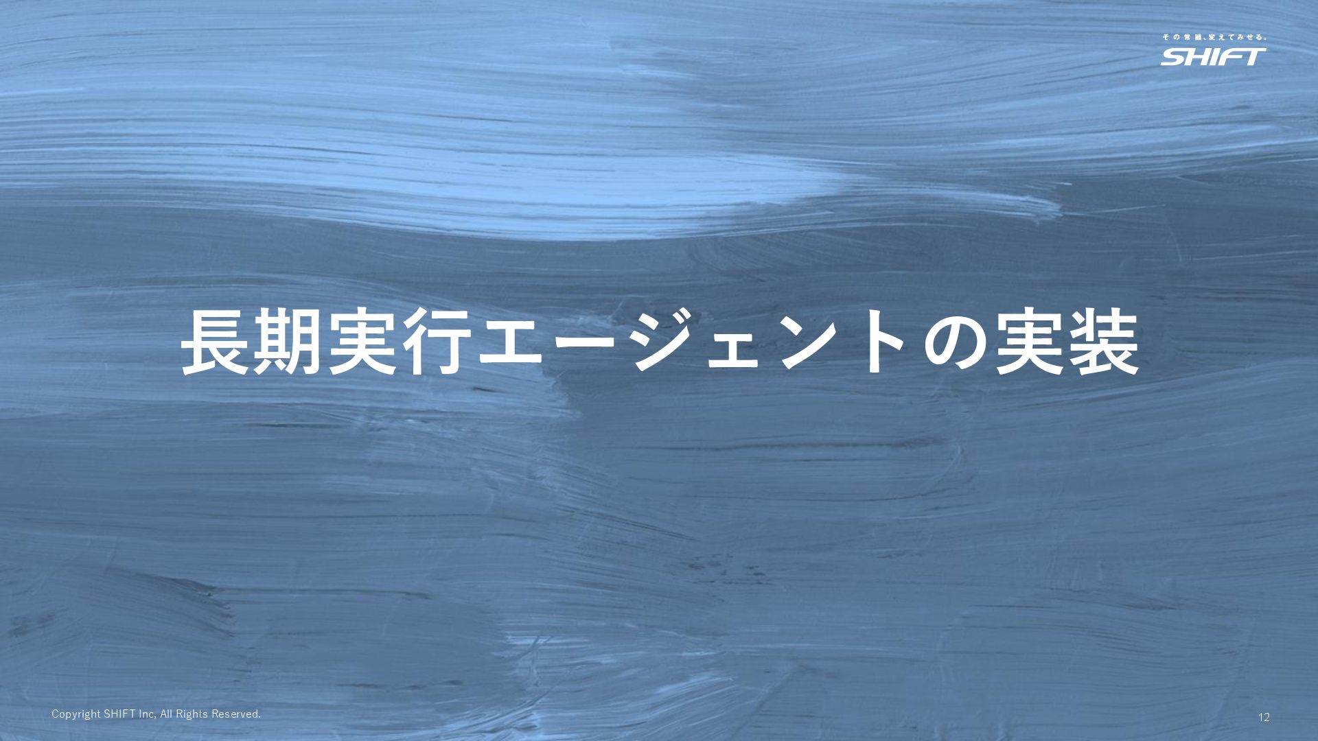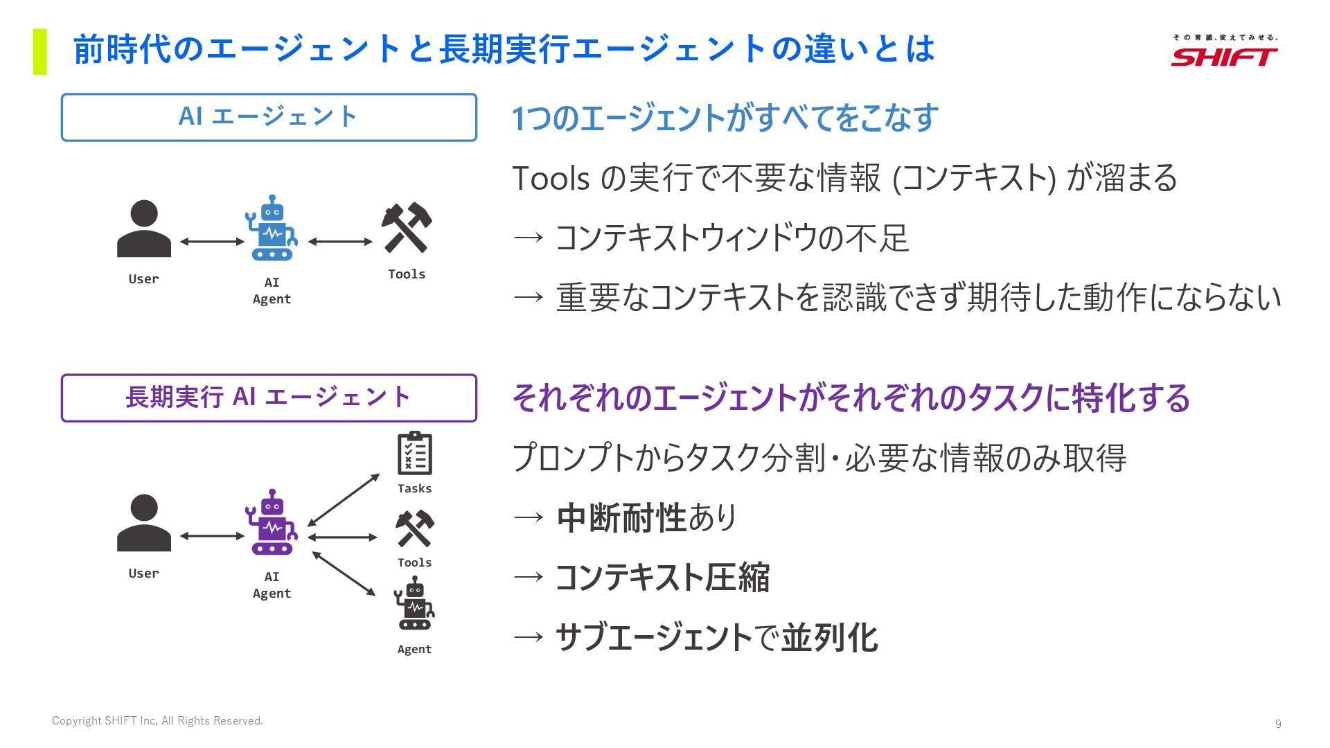 エージェント AI チャットボット 長期実行 AI エージェント LLM • 最新の情報を取得できない • 学習カットオフの影響を強く受ける User • 最新の情報を取得できる • 任意の操作を実行できる • 人間が行っていたことを「代行」する AI Agent User Tools • 自らタスクを作成する • コンテキストを管理する • 複雑なタスクをツールを使用して遂行する AI Agent User Tools Tasks Agent
