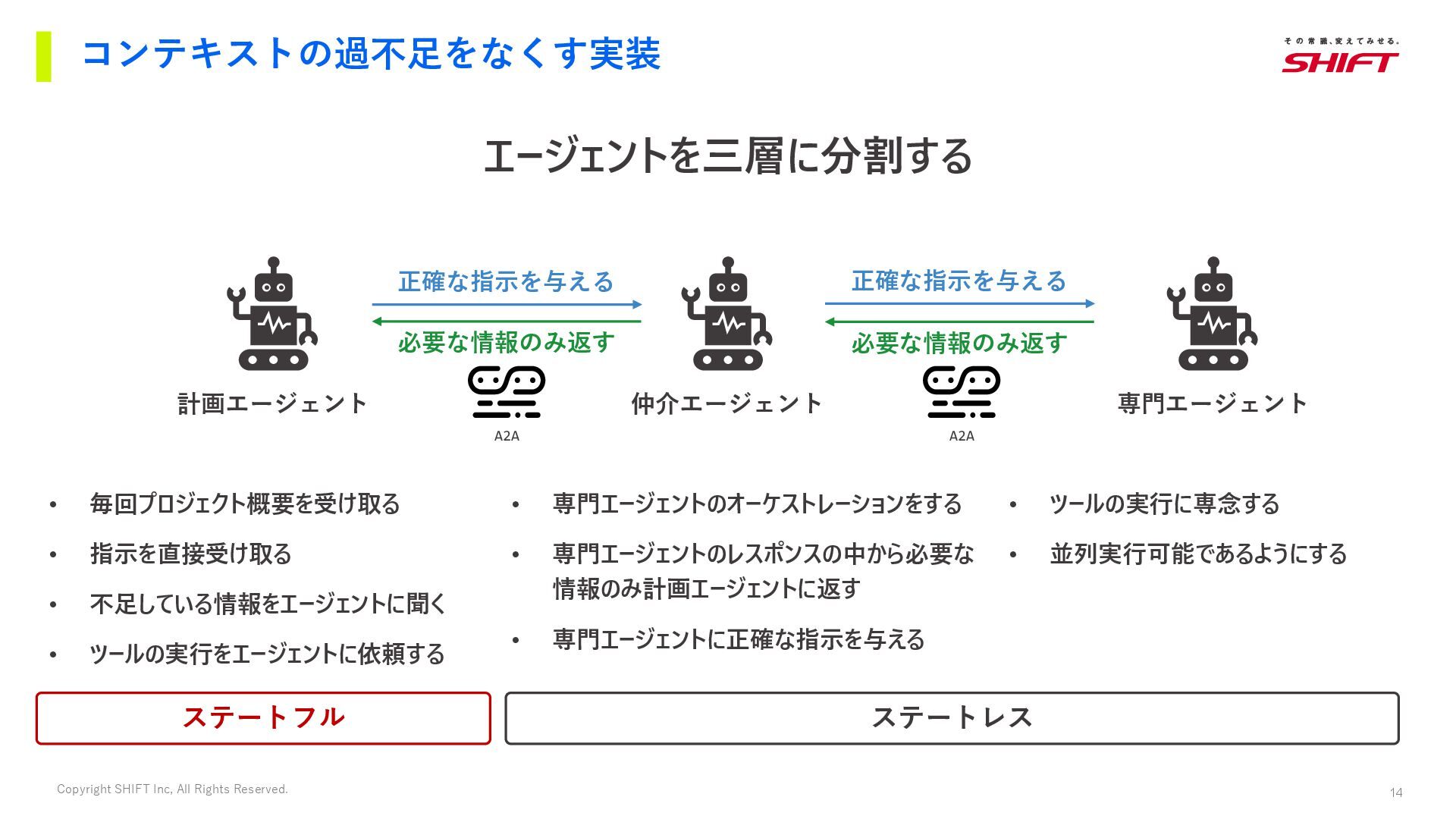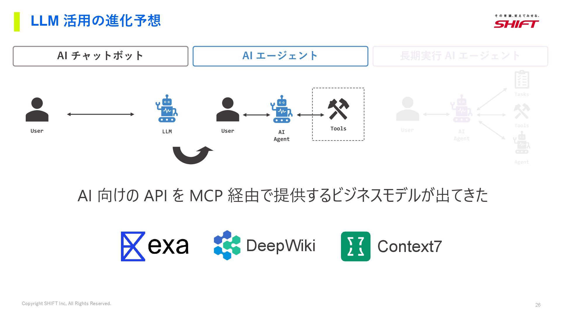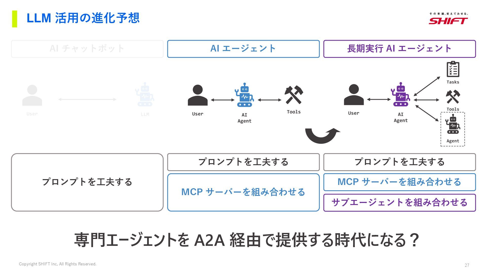 エージェント AI チャットボット 長期実行 AI エージェント LLM User AI Agent User Tools AI Agent User Tools Tasks Agent 専門エージェントを A2A 経由で提供する時代になる? プロンプトを工夫する MCP サーバーを組み合わせる プロンプトを工夫する プロンプトを工夫する MCP サーバーを組み合わせる サブエージェントを組み合わせる