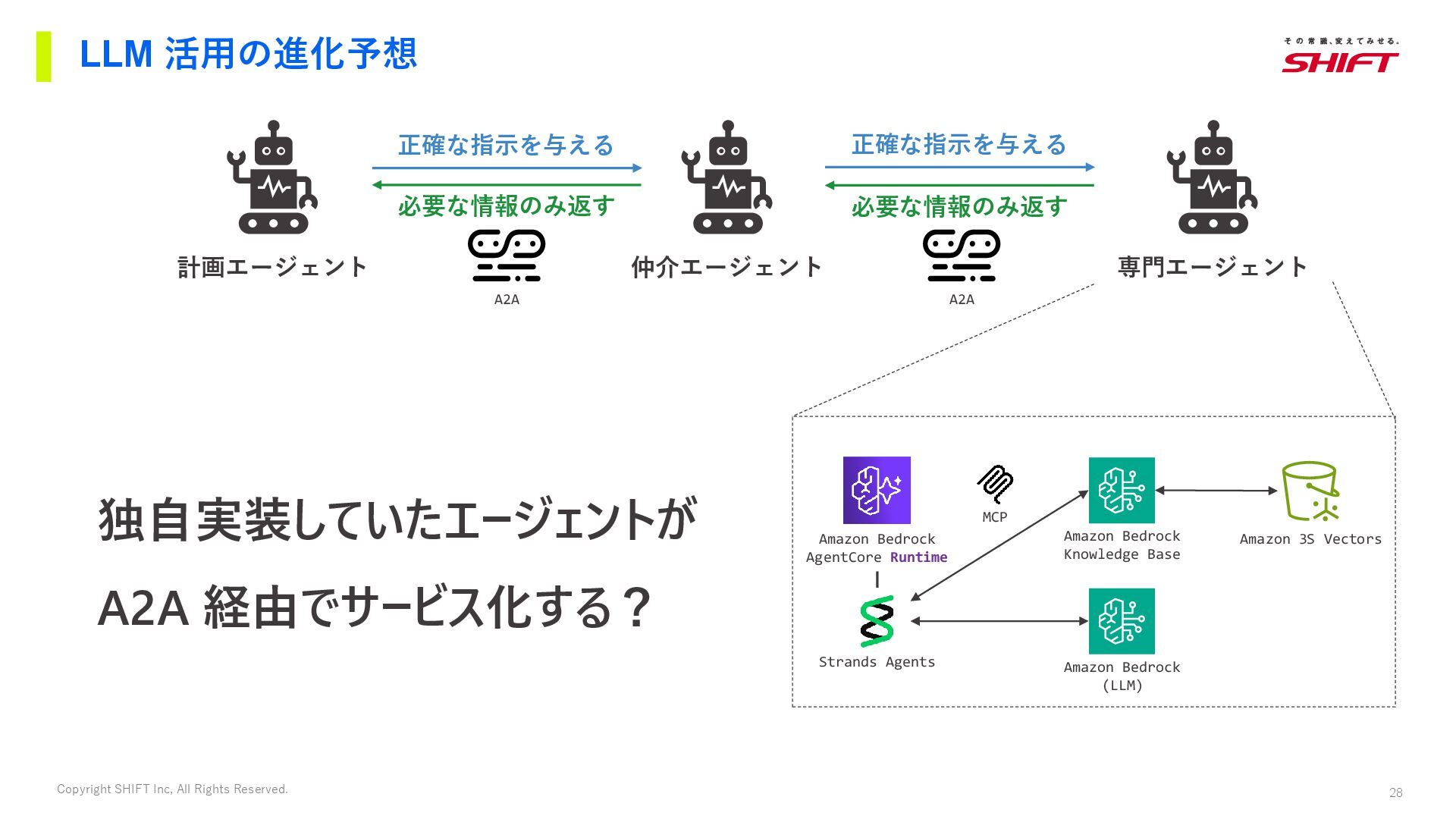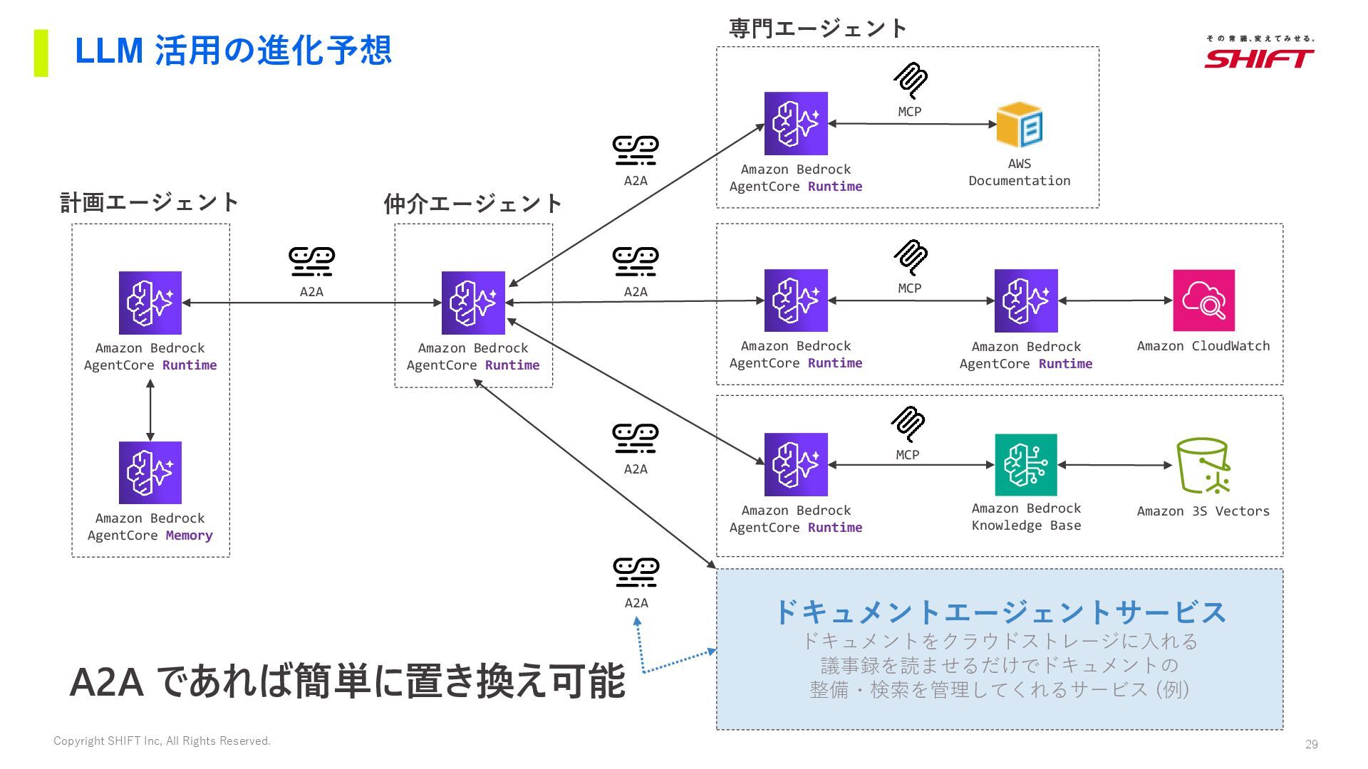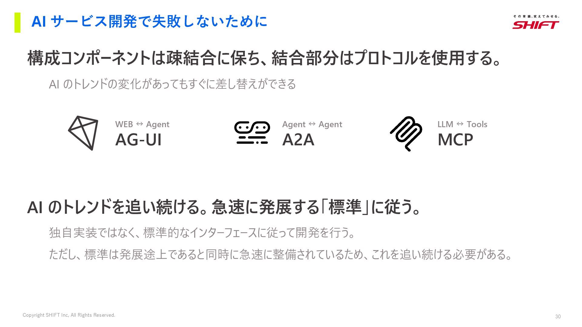 AI のトレンドの変化があってもすぐに差し替えができる WEB Agent AG-UI Agent Agent A2A LLM Tools MCP AI のトレンドを追い続ける。急速に発展する「標準」に従う。 独自実装ではなく、標準的なインターフェースに従って開発を行う。 ただし、標準は発展途上であると同時に急速に整備されているため、これを追い続ける必要がある。
