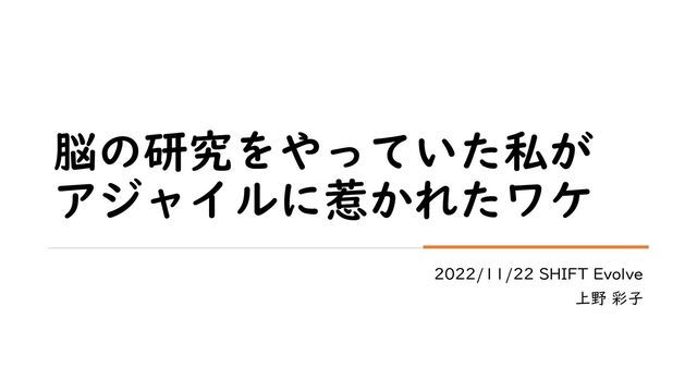 脳の研究をやっていた私が アジャイルに惹かれたワケ 2022/11/22 SHIFT Evolve 上野 彩子