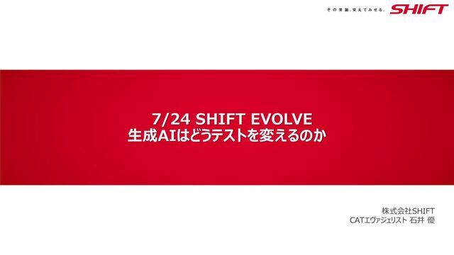 2024/7/24 生成AIはどうテストを変えるのか (AI Test Lab vol.1) https://shiftevolve.connpass.com/event/322911/ 株式会社SHIFT CATエヴァンジェリスト 石井 優