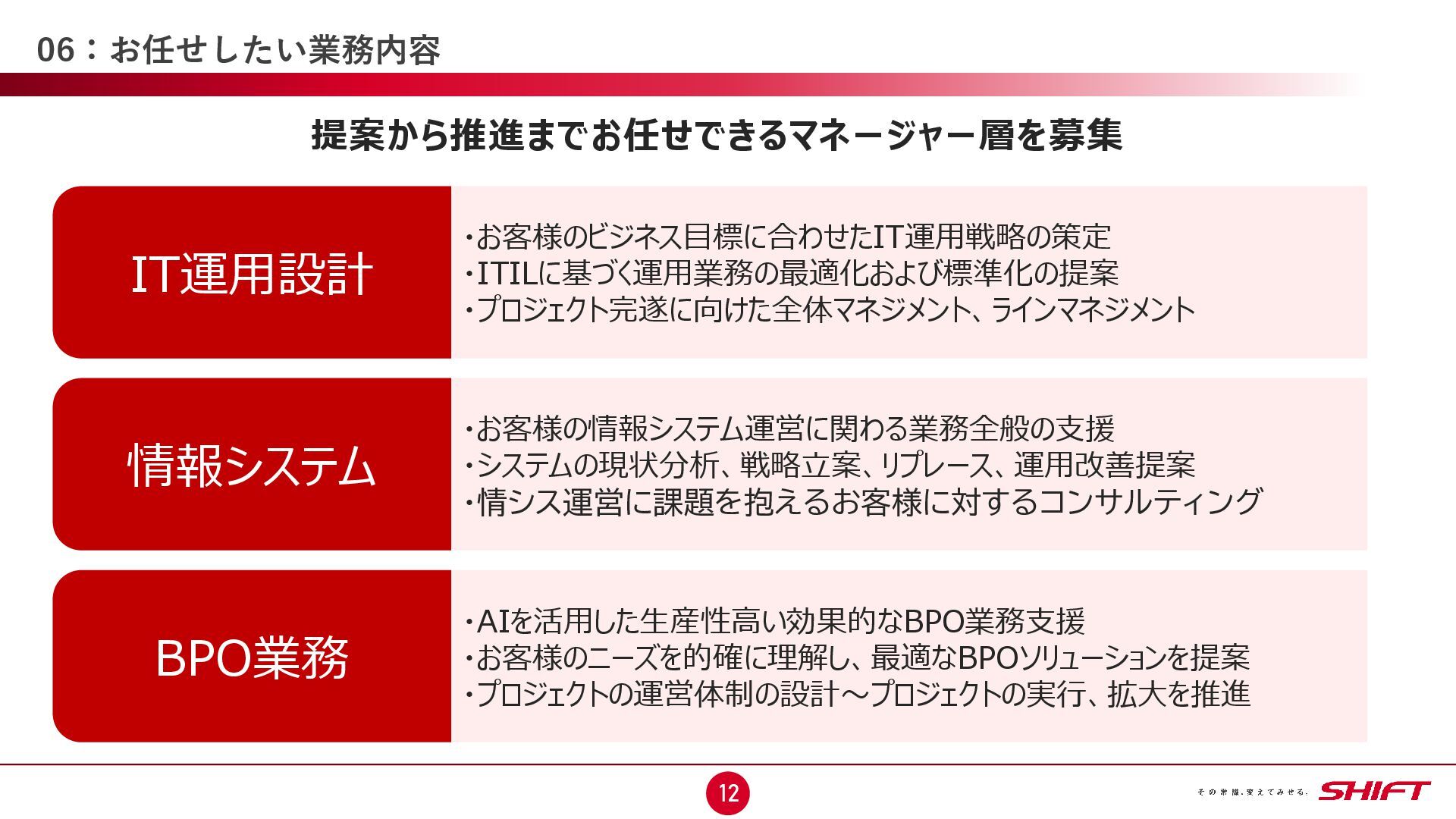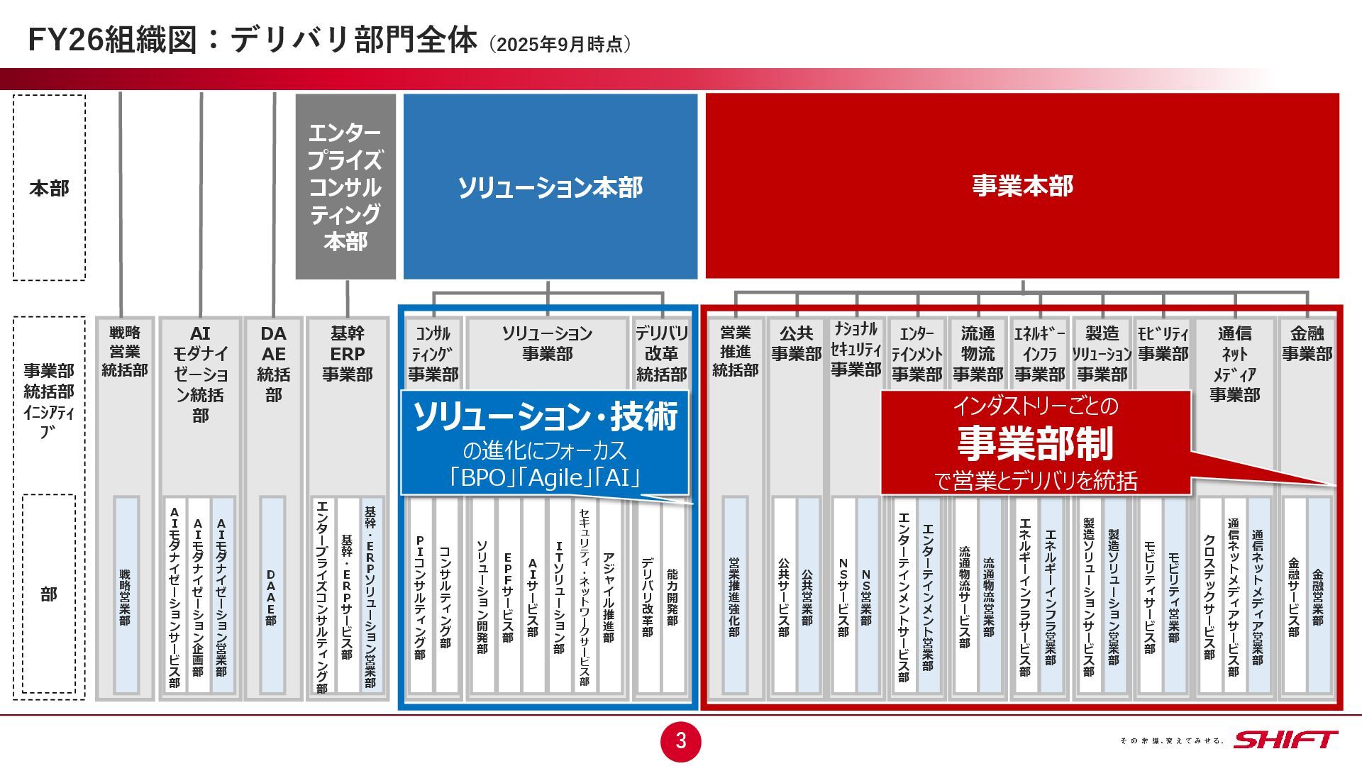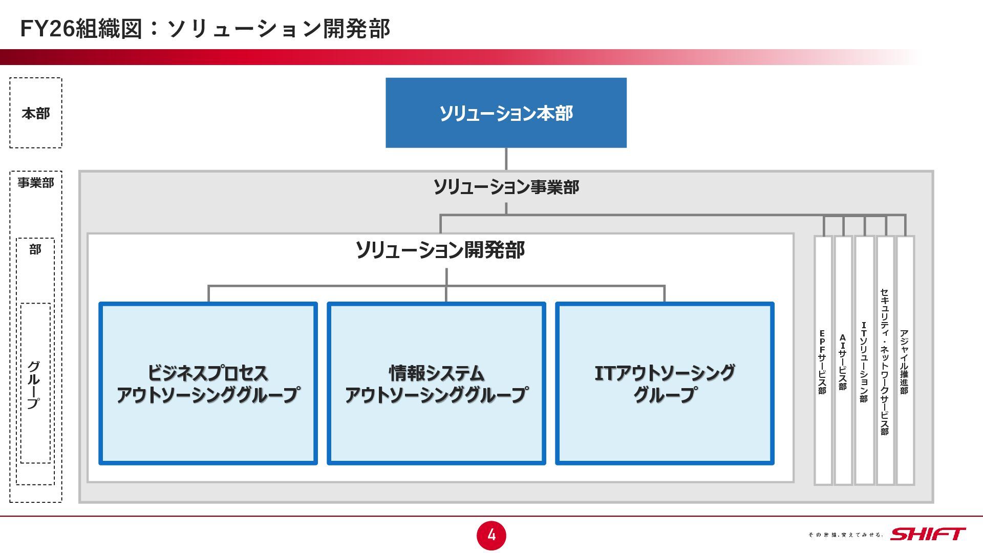 本部 AI モダナイ ゼーショ ン統括 部 3 FY26組織図:デリバリ部門全体(2025年9月時点) コンサル ティング 事業部 事業部 統括部 イニシアティ ブ 部 戦略 営業 統括部 DA AE 統括 部 D A A E 部 A I モ ダ ナ イ ゼ ー シ ョ ン 営 業 部 公共 事業部 公 共 営 業 部 公 共 サ ー ビ ス 部 ナショナル セキュリティ 事業部 N S 営 業 部 N S サ ー ビ ス 部 エンター テインメント 事業部 エ ン タ ー テ イ ン メ ン ト 営 業 部 エ ン タ ー テ イ ン メ ン ト サ ー ビ ス 部 製造 ソリューション 事業部 製 造 ソ リ ュ ー シ ョ ン 営 業 部 製 造 ソ リ ュ ー シ ョ ン サ ー ビ ス 部 モビリティ 事業部 モ ビ リ テ ィ 営 業 部 モ ビ リ テ ィ サ ー ビ ス 部 流通 物流 事業部 通信 ネット メディア 事業部 通 信 ネ ッ ト メ デ ィ ア 営 業 部 通 信 ネ ッ ト メ デ ィ ア サ ー ビ ス 部 エネルギー インフラ 事業部 金融 事業部 金 融 営 業 部 金 融 サ ー ビ ス 部 エ ネ ル ギ ー イ ン フ ラ 営 業 部 エ ネ ル ギ ー イ ン フ ラ サ ー ビ ス 部 流 通 物 流 営 業 部 流 通 物 流 サ ー ビ ス 部 事業本部 ソリューション本部 ソリューション 事業部 P I コ ン サ ル テ ィ ン グ 部 デリバリ 改革 統括部 能 力 開 発 部 デ リ バ リ 改 革 部 セ キ ュ リ テ ィ ・ ネ ッ ト ワ ー ク サ ー ビ ス 部 ソ リ ュ ー シ ョ ン 開 発 部 A I サ ー ビ ス 部 E P F サ ー ビ ス 部 ア ジ ャ イ ル 推 進 部 I T ソ リ ュ ー シ ョ ン 部 戦 略 営 業 部 基幹 ERP 事業部 基 幹 ・ E R P ソ リ ュ ー シ ョ ン 営 業 部 エ ン タ ー プ ラ イ ズ コ ン サ ル テ ィ ン グ 部 インダストリーごとの 事業部制 で営業とデリバリを統括 エンター プライズ コンサル ティング 本部 コ ン サ ル テ ィ ン グ 部 基 幹 ・ E R P サ ー ビ ス 部 A I モ ダ ナ イ ゼ ー シ ョ ン サ ー ビ ス 部 A I モ ダ ナ イ ゼ ー シ ョ ン 企 画 部 ソリューション・技術 の進化にフォーカス 「BPO」「Agile」「AI」 ク ロ ス テ ッ ク サ ー ビ ス 部