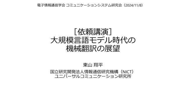 など – ユーザが「書く・発信する」行動の支援 • 非母語話者が書いた文章の校正、断片的テキストからの言語横断作文 など Subject: Scheduling a Meeting for Project Update Dear [Colleague's Name], I hope you are doing well. I would like to schedule a meeting to go over the current status of our project. If convenient, could we plan for either Monday or Tuesday next week? Please let me know which day and time would work best for you. Thank you, and I look forward to our discussion. … 次の内容で、海外支社の同僚宛の英語メールを 書いてください。 ・用件:ミーティング設定 ・内容:プロジェクト進捗確認 ・日時:来週の月曜日か火曜日 ユーザ入力 LLM 出力(GPT-4o) 多言語コミュニケーションのための “汎用アシスタント” へ?