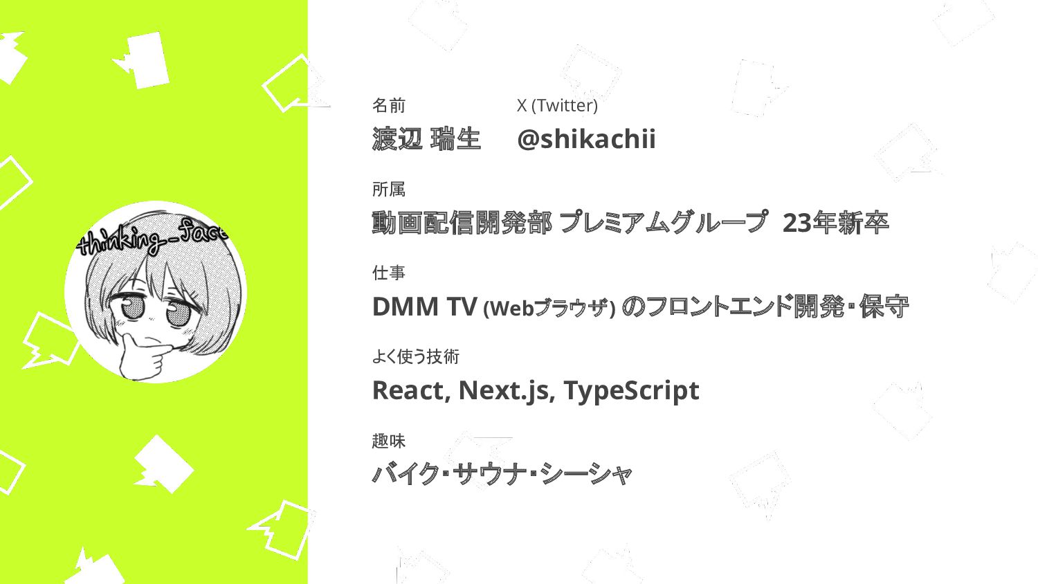 (Webブラウザ) のフロントエンド開発・保守 X (Twitter) @shikachii 趣味 バイク・サウナ・シーシャ よく使う技術 React, Next.js, TypeScript