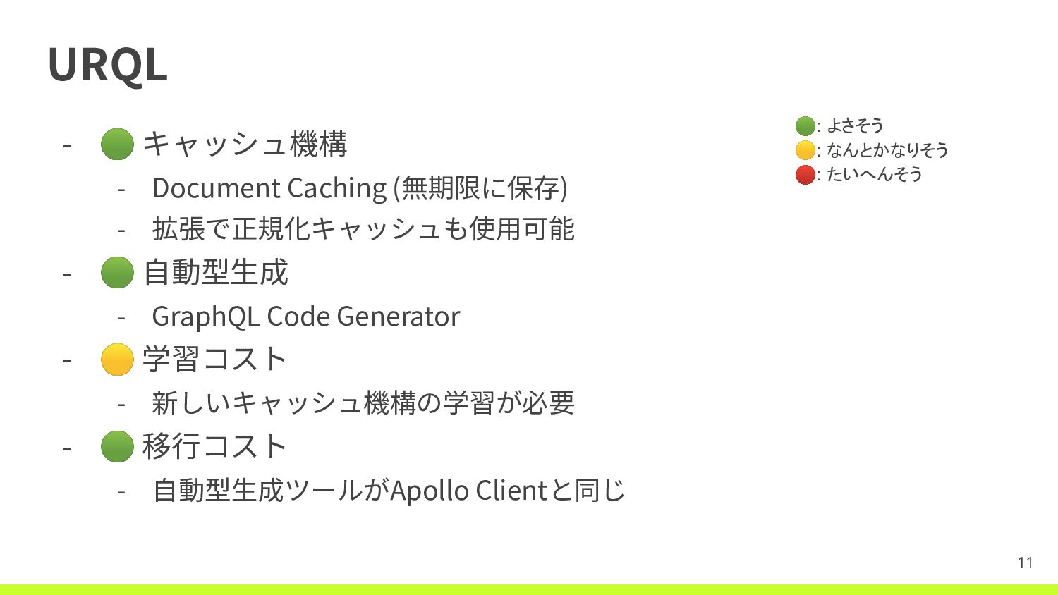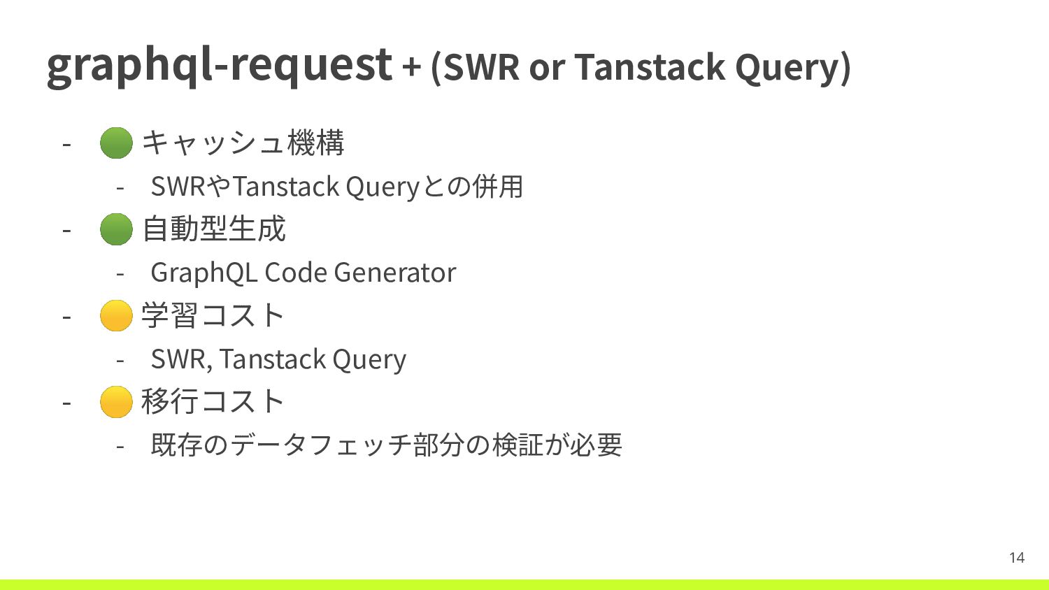 - 🟢 ⾃動型⽣成 - GraphQL Code Generator - 🟡 学習コスト - 新しいキャッシュ機構の学習が必要 - 🟢 移⾏コスト - ⾃動型⽣成ツールがApollo Clientと同じ 11 🟢: よさそう 🟡: なんとかなりそう 🔴: たいへんそう
