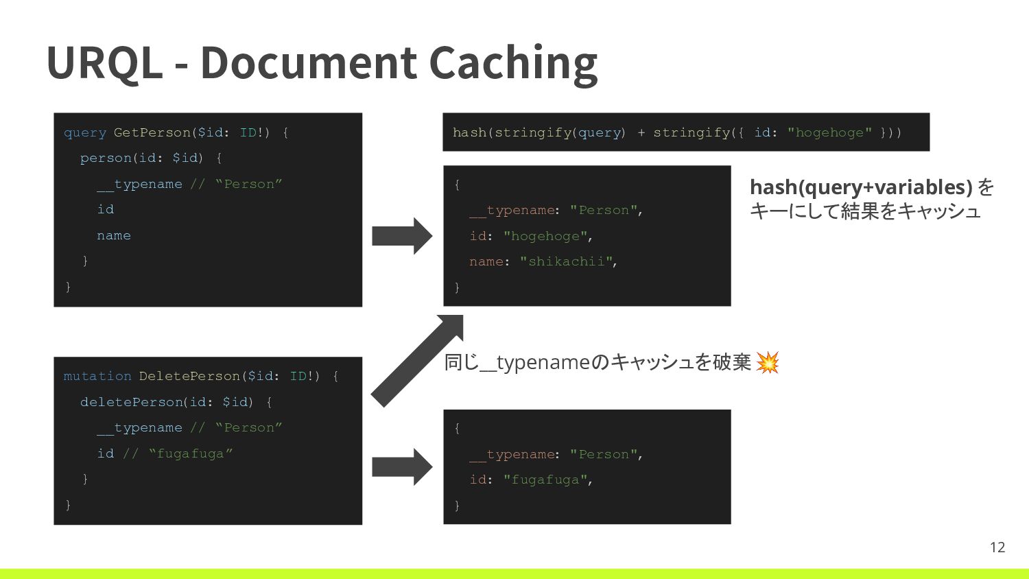 ID!) { person(id: $id) { __typename // “Person” id name } } { __typename: "Person", id: "hogehoge", name: "shikachii", } mutation DeletePerson($id: ID!) { deletePerson(id: $id) { __typename // “Person” id // “fugafuga” } } 同じ__typenameのキャッシュを破棄💥 { __typename: "Person", id: "fugafuga", } hash(stringify(query) + stringify({ id: "hogehoge" }))