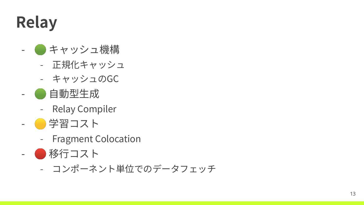 ⾃動型⽣成 - Relay Compiler - 🟡 学習コスト - Fragment Colocation - 🔴 移⾏コスト - コンポーネント単位でのデータフェッチ 13