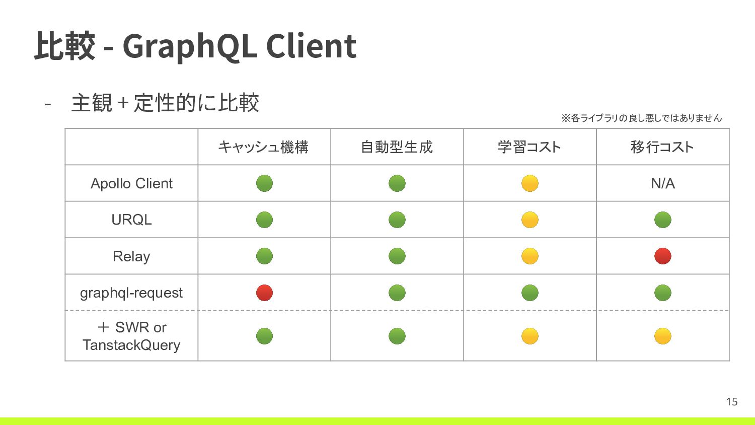 ⽐較 - GraphQL Client - 主観 + 定性的に⽐較 15 ※各ライブラリの良し悪しではありません