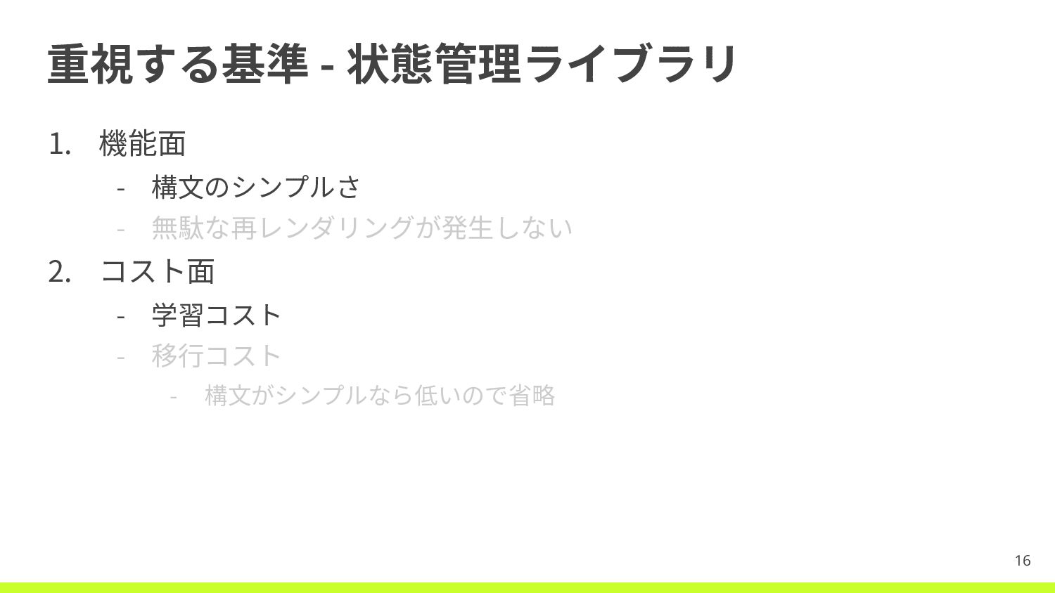 重視する基準 - 状態管理ライブラリ 1. 機能⾯ - 構⽂のシンプルさ - 無駄な再レンダリングが発⽣しない 2.