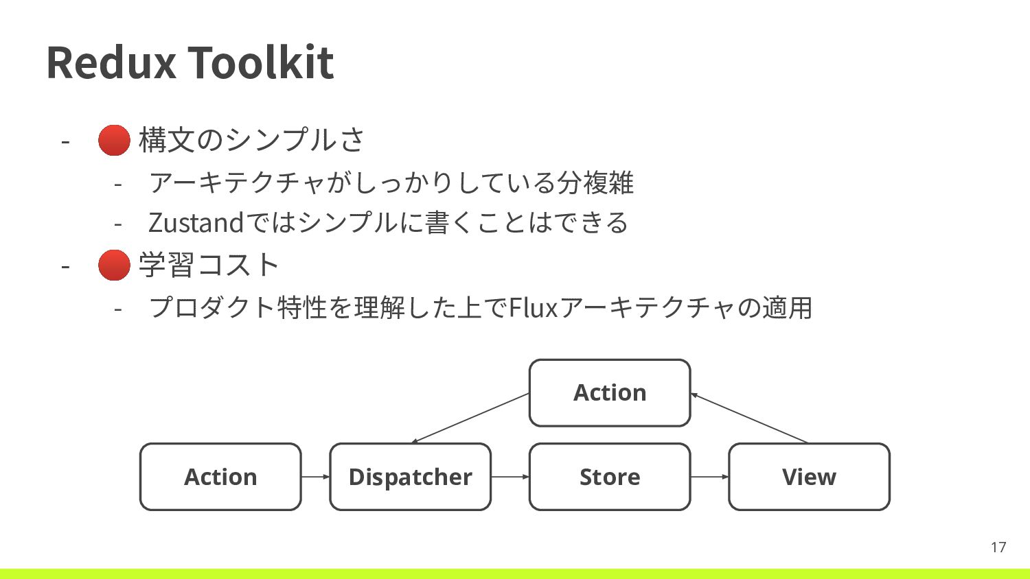 🔴 学習コスト - プロダクト特性を理解した上でFluxアーキテクチャの適⽤ 17 Action Dispatcher Store View Action