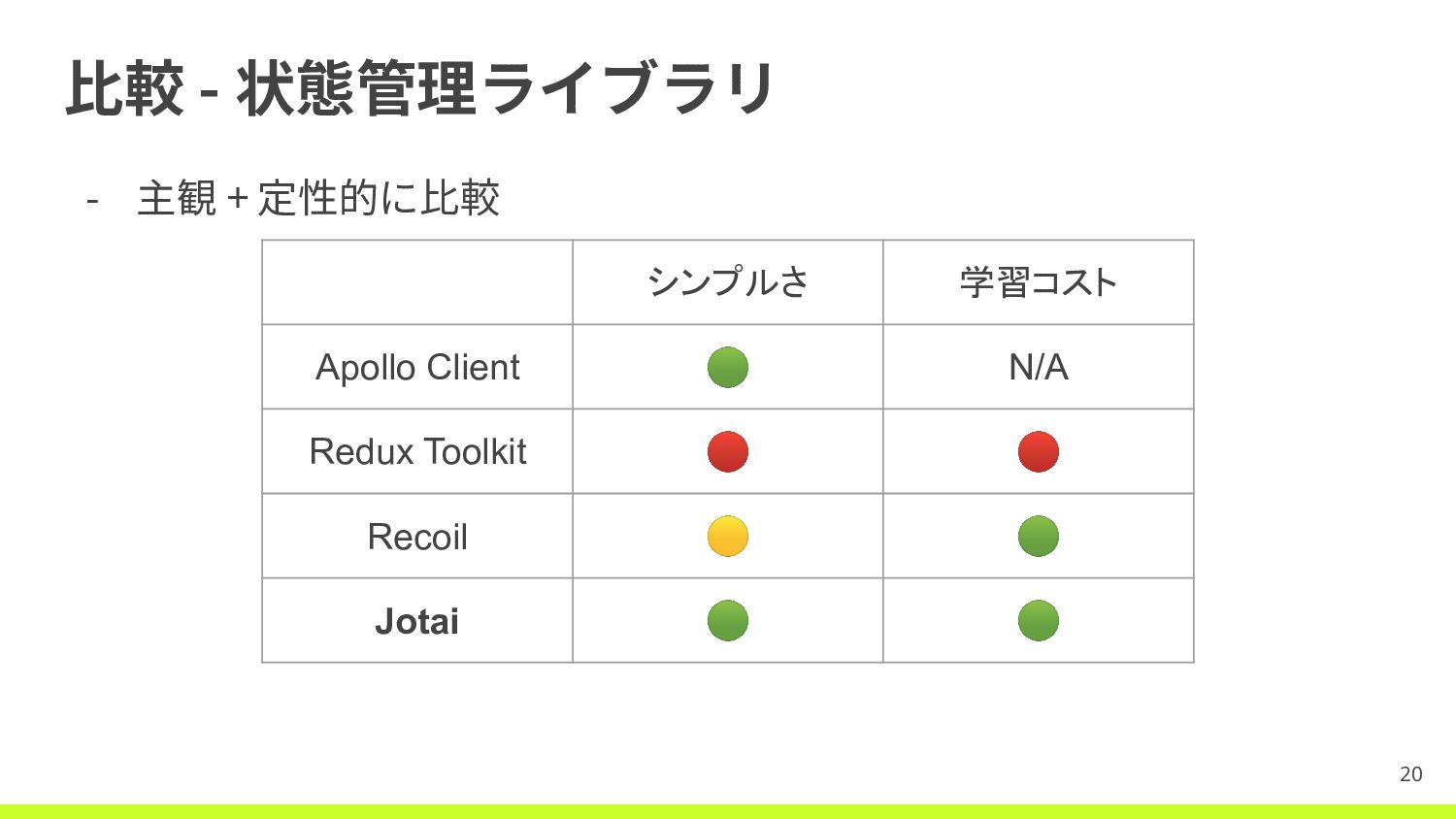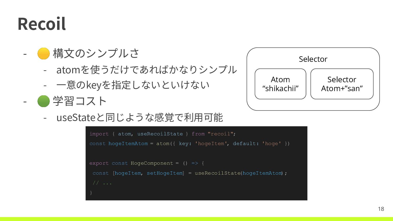 Jotai - 🟢 構⽂のシンプルさ - Recoilで必要だった⼀意のkey管理が不要 - 🟢 学習コスト -