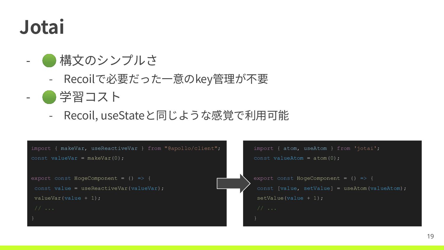 Recoil, useStateと同じような感覚で利⽤可能 19 import { makeVar, useReactiveVar } from "@apollo/client"; const valueVar = makeVar(0); export const HogeComponent = () => { const value = useReactiveVar(valueVar); valueVar(value + 1); // ... } import { atom, useAtom } from 'jotai'; const valueAtom = atom(0); export const HogeComponent = () => { const [value, setValue] = useAtom(valueAtom); setValue(value + 1); // ... }