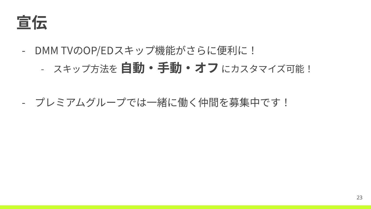 宣伝 - DMM TVのOP/EDスキップ機能がさらに便利に! - スキップ⽅法を ⾃動‧⼿動‧オフ にカスタマイズ可能! - プレミアムグループでは⼀緒に働く仲間を募集中です!