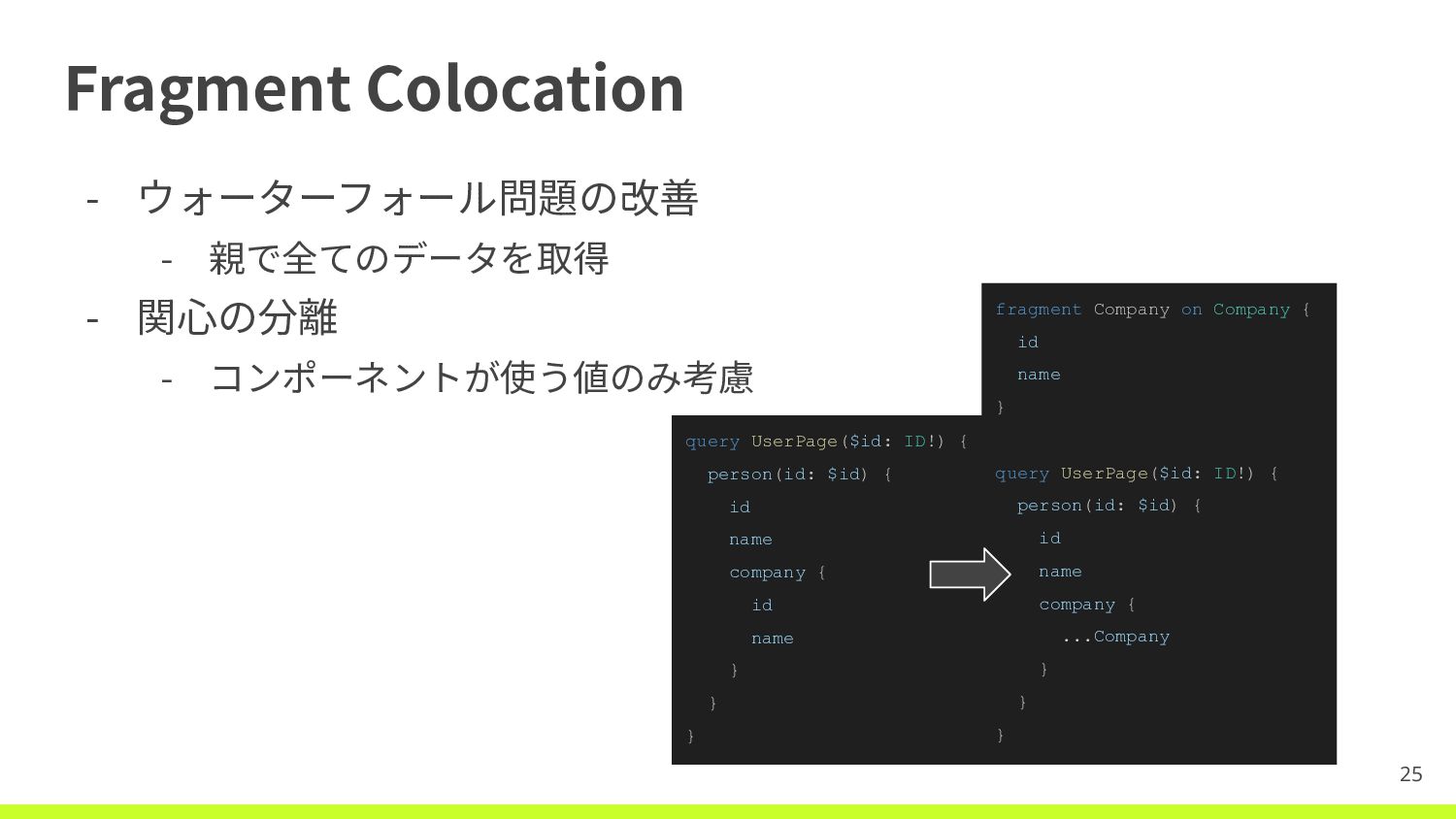Fragment Colocation - ウォーターフォール問題の改善 - 親で全てのデータを取得 - 関⼼の分離 - コンポーネントが使う値のみ考慮