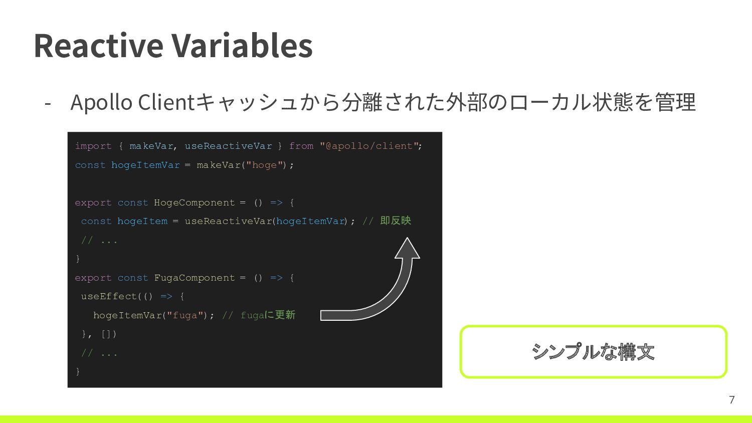 Reactive Variables - Apollo Clientキャッシュから分離された外部のローカル状態を管理 7 import { makeVar, useReactiveVar