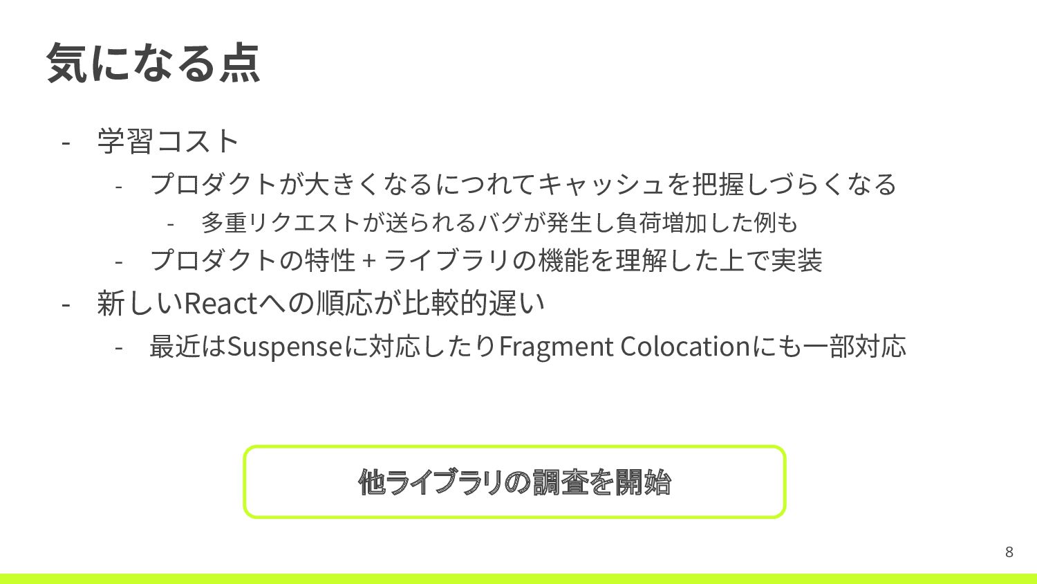 ライブラリの機能を理解した上で実装 - 新しいReactへの順応が⽐較的遅い - 最近はSuspenseに対応したりFragment Colocationにも⼀部対応 8 他ライブラリの調査を開始