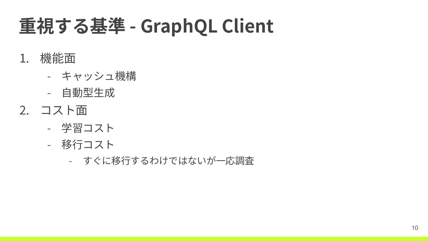 2. コスト⾯ - 学習コスト - 移⾏コスト - すぐに移⾏するわけではないが⼀応調査 10