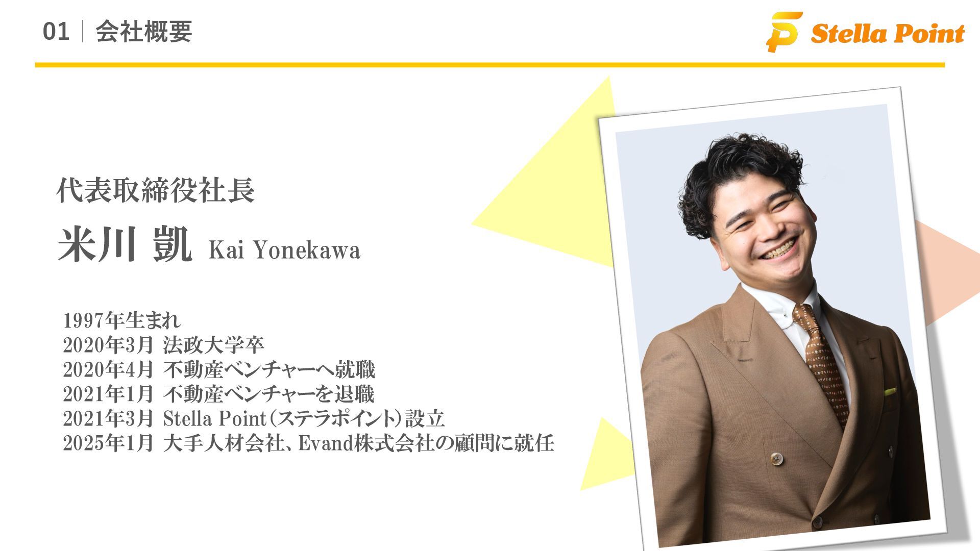 2021年1月 不動産ベンチャーを退職 2021年3月 Stella Point(ステラポイント)設立 2025年1月 大手人材会社、Evand株式会社の顧問に就任 01|会社概要