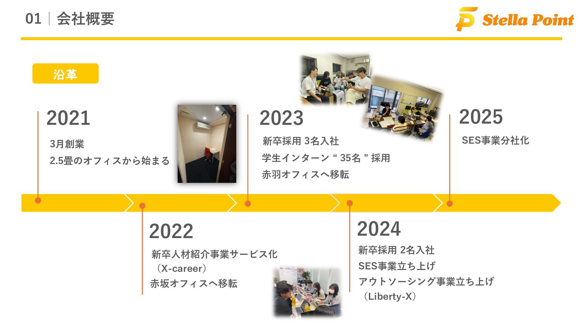 3⽉創業 2.5畳のオフィスから始まる 2021 2022 2023 2025 2024 新卒⼈材紹介事業サービス化 ⾚坂オフィスへ移転 (X-career)