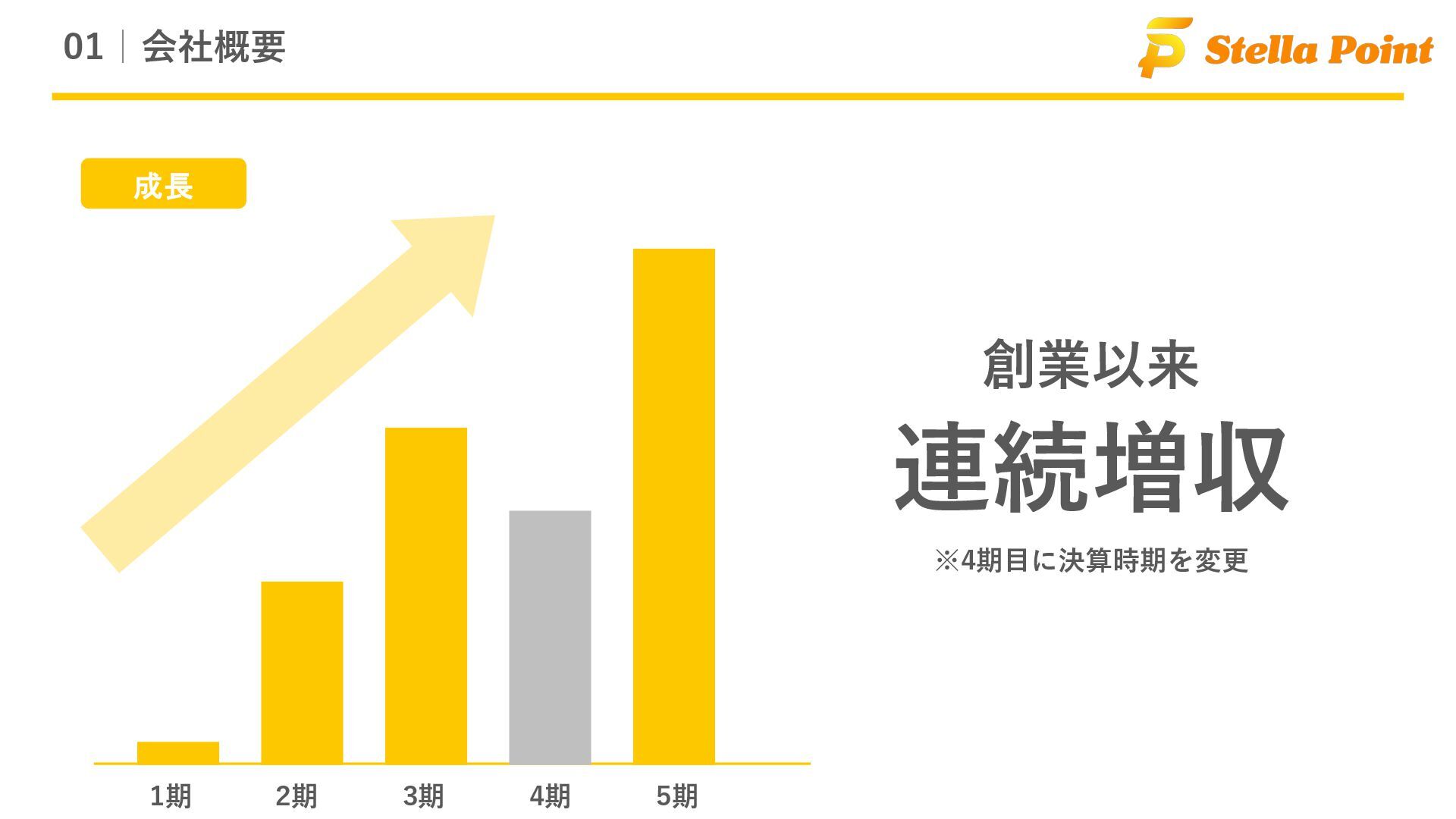 成長 01|会社概要 連続増収 1期 2期 3期 4期 5期 創業以来 ※4期⽬に決算時期を変更