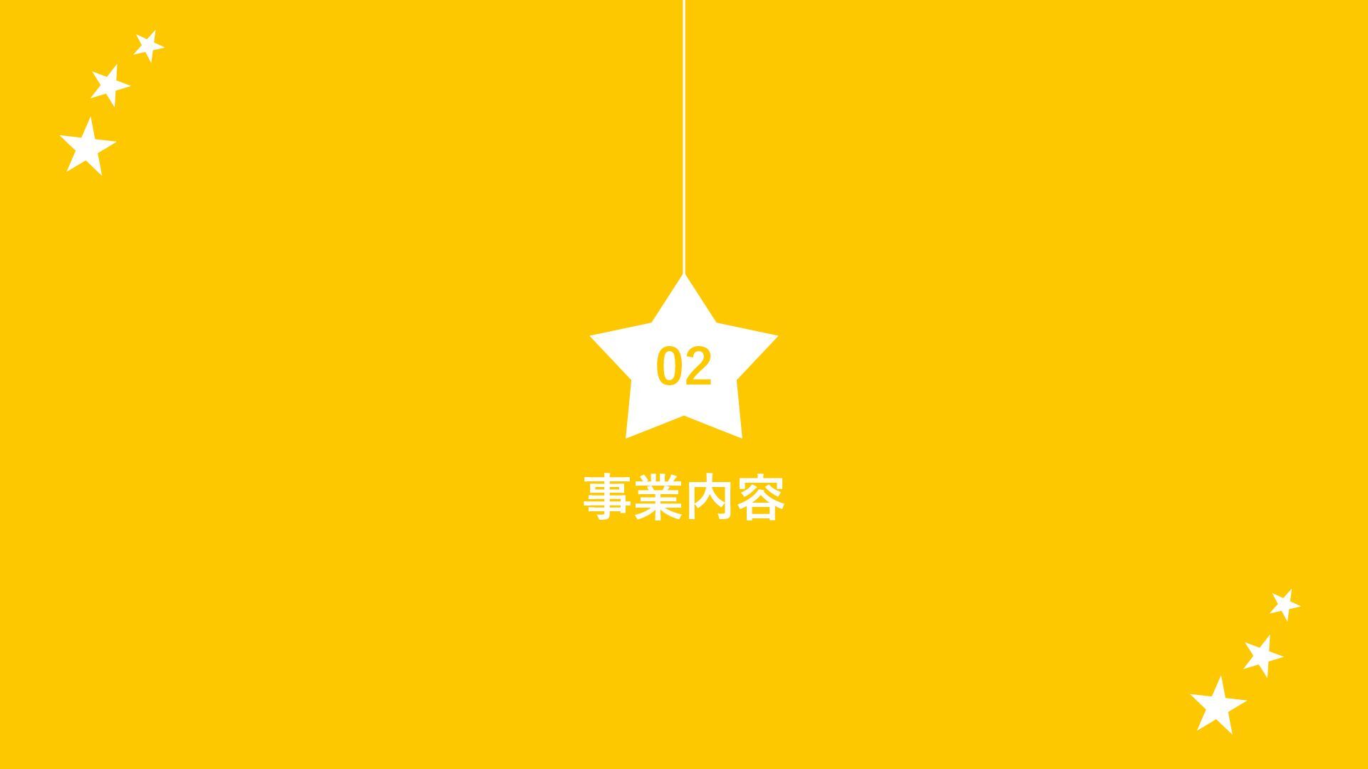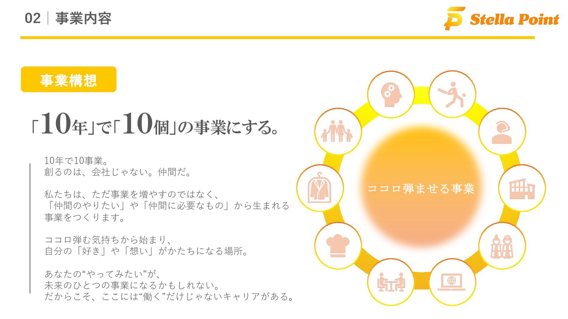 02|事業内容 ココロ弾ませる事業 「 10年」で「 10個」の事業にする。 10年で10事業。 創るのは、会社じゃない。仲間だ。 私たちは、ただ事業を増やすのではなく、 「仲間のやりたい」や「仲間に必要なもの」から⽣まれる 事業をつくります。