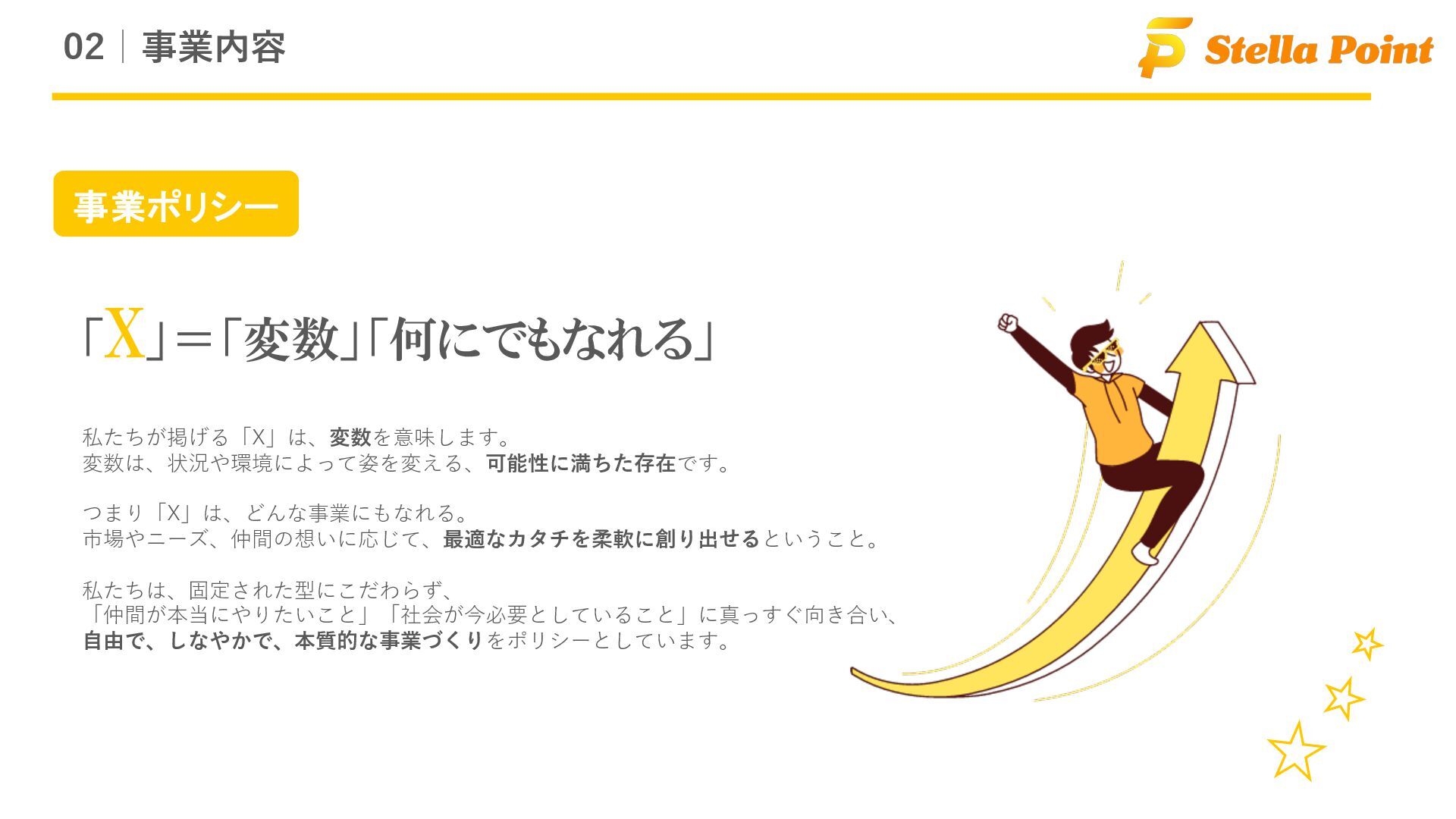 02|事業内容 事業ポリシー 「X」=「変数」「何にでもなれる」 私たちが掲げる「X」は、変数を意味します。 変数は、状況や環境によって姿を変える、可能性に満ちた存在です。 つまり「X」は、どんな事業にもなれる。 市場やニーズ、仲間の想いに応じて、最適なカタチを柔軟に創り出せるということ。 私たちは、固定された型にこだわらず、 「仲間が本当にやりたいこと」「社会が今必要としていること」に真っすぐ向き合い、 ⾃由で、しなやかで、本質的な事業づくりをポリシーとしています。