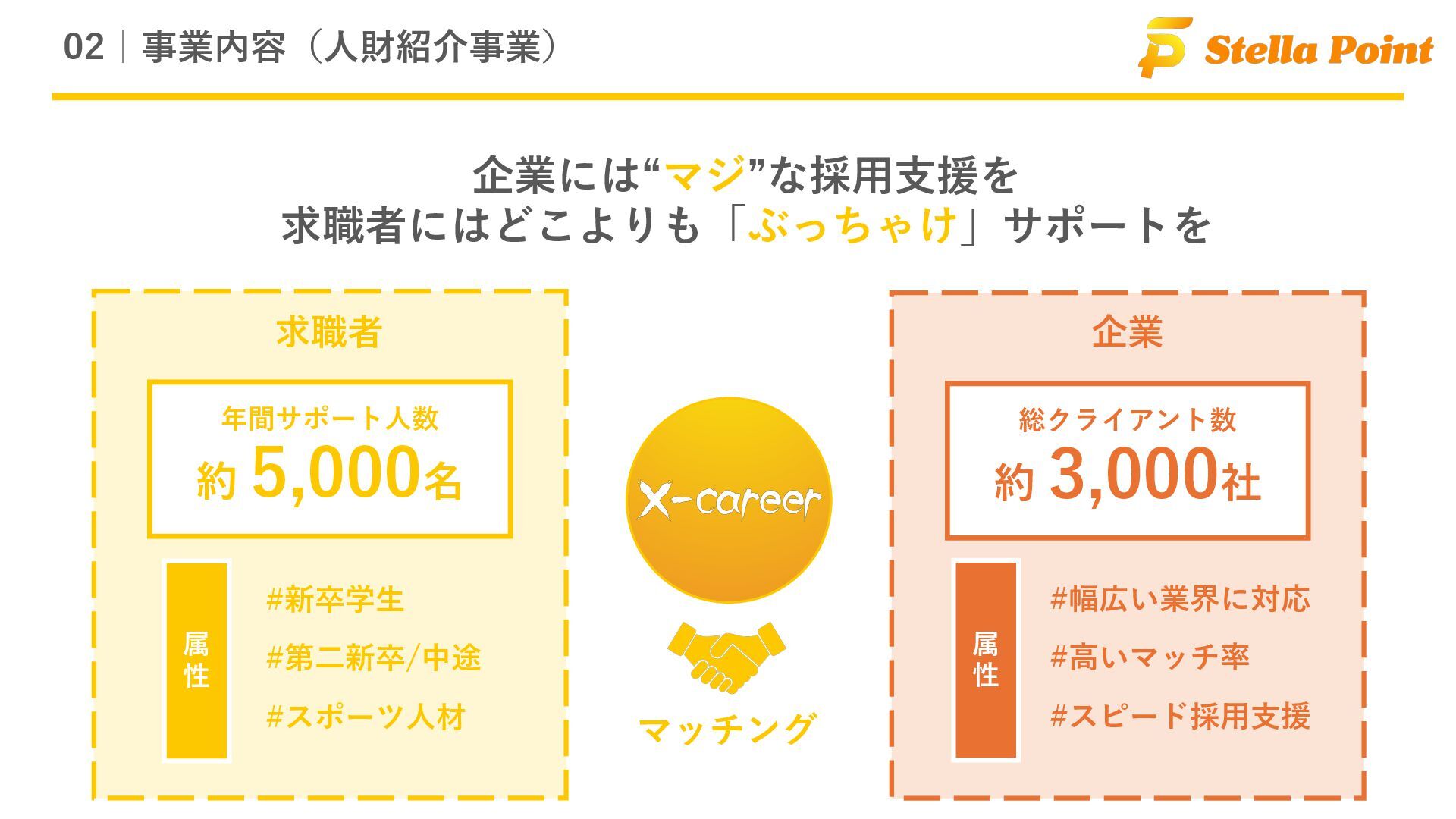 02|事業内容(⼈財紹介事業) 求職者 企業 年間サポート⼈数 約 5,000名 総クライアント数 約 3,000社 #新卒学⽣