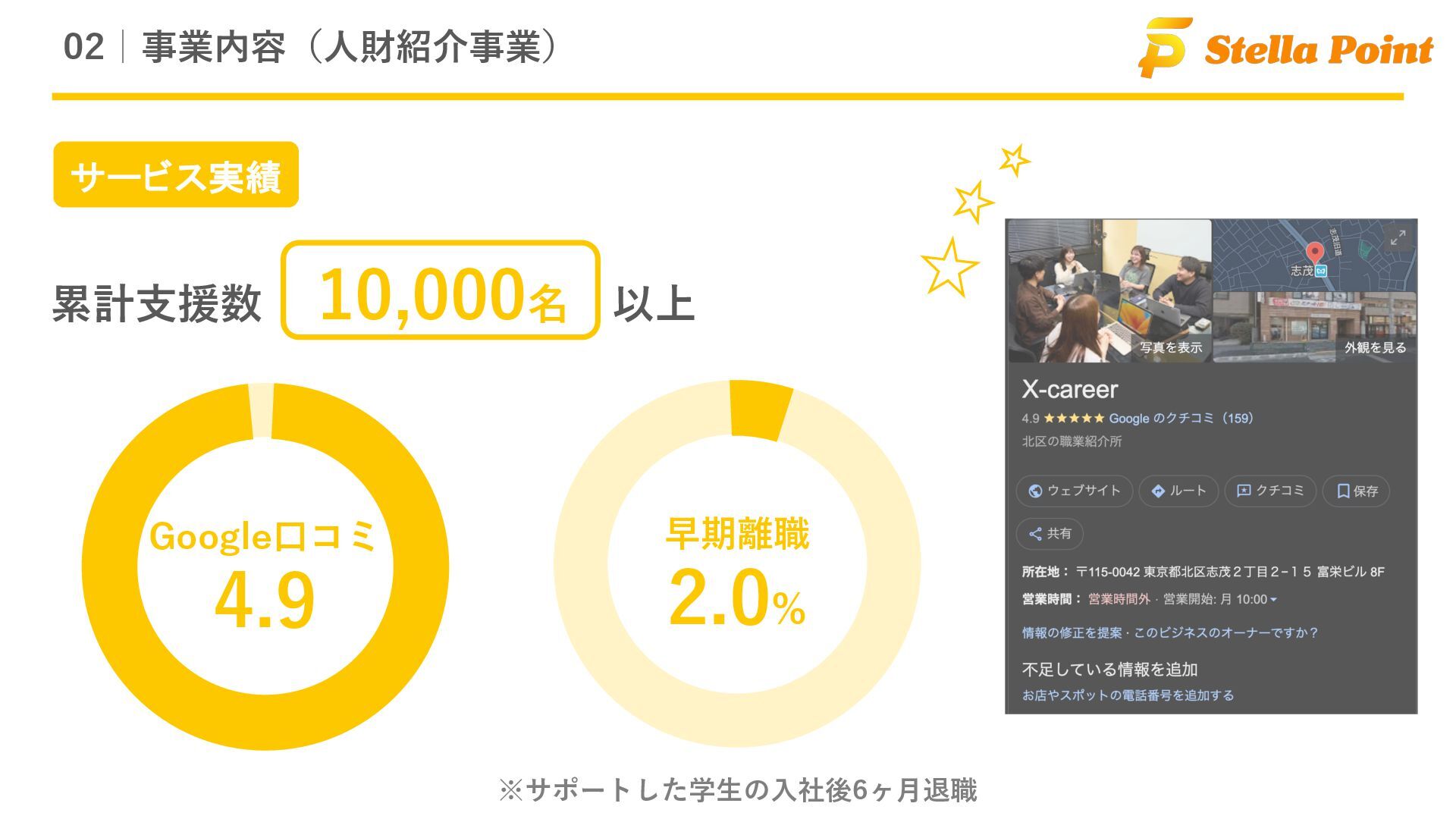 02|事業内容(⼈財紹介事業) Google⼝コミ 4.9 早期離職 2.0% 累計⽀援数 10,000名 以上 ※サポートした学⽣の⼊社後6ヶ⽉退職 サービス実績