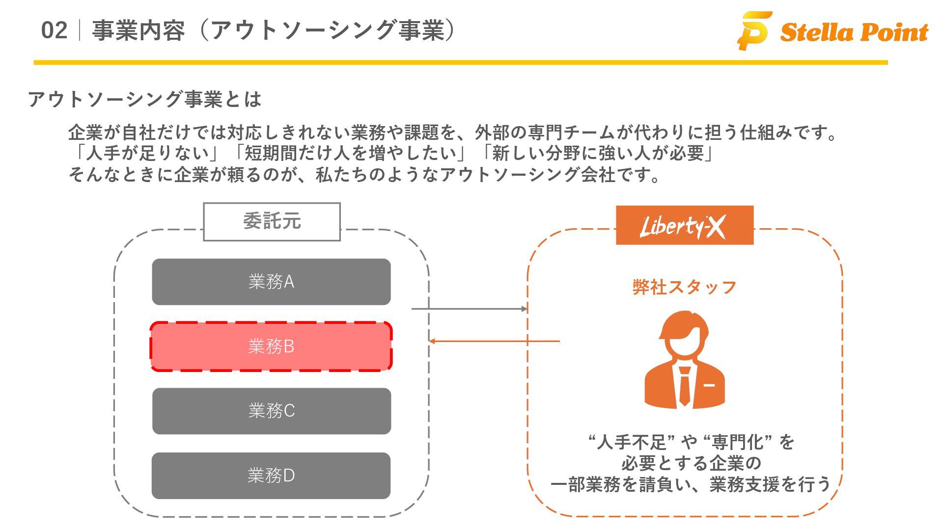 02|事業内容(アウトソーシング事業) アウトソーシング事業とは 業務A 業務B 業務C 業務D 委託元 “⼈⼿不⾜” や “専⾨化”